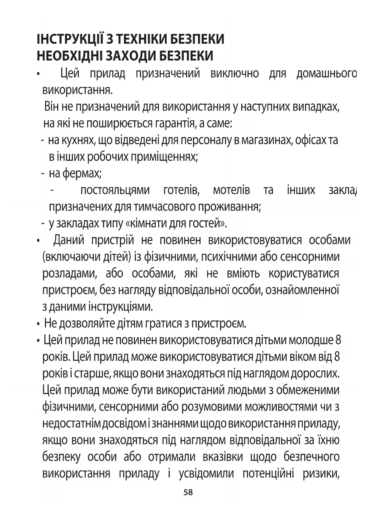 - Цей прилад не повинен використовуватися дітьми молодше 8 років. Цей прилад може використовуватися дітьми віком від 8 років і старше, якщо вони знаходяться під наглядом дорослих. Цей прилад може бути використаний людьми з обмеженими фізичними, сенсорними або розумовими можливостями чи з недостатнім досвідом і знаннями щодо використання приладу, якщо вони знаходяться під наглядом відповідальної за їхню безпеку особи або отримали вказівки щодо безпечного використання приладу і усвідомили потенційні ризики,59