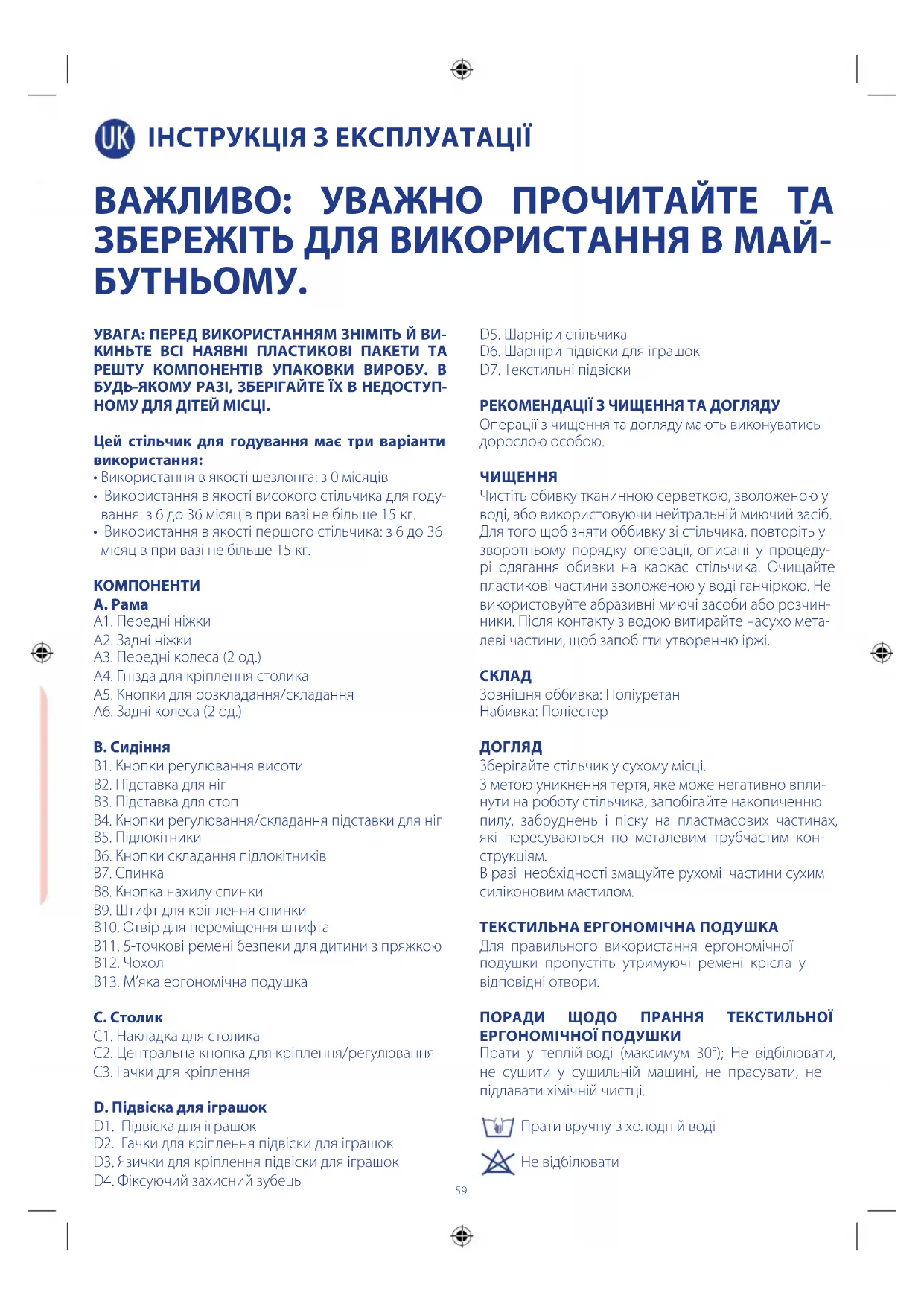 A. Рама A1. Передні ніжки A2. Задні ніжки A3. Передні колеса (2 од.) A4. Гнізда для кріплення столика A5. Кнопки для розкладання/складання A6. Задні колеса (2 од.) B. Сидіння B1. Кнопки регулювання висоти B2. Підставка для ніг B3. Підставка для стоп B4. Кнопки регулювання/складання підставки для ніг B5. Підлокітники B6. Кнопки складання підлокітників B7. Спинка B8. Кнопка нахилу спинки B9. Штифт для кріплення спинки B10. Отвір для переміщення штифта B11. 5-точкові ремені безпеки для дитини з пряжкою B12. Чохол B13. М’яка ергономічна подушка C. Столик C1. Накладка для столика C2. Центральна кнопка для кріплення/регулювання C3. Гачки для кріплення D. Підвіска для іграшок D1. Підвіска для іграшок D2. Гачки для кріплення підвіски для іграшок D3. Язички для кріплення підвіски для іграшок D4. Фіксуючий захисний зубець D5. Шарніри стільчика D6. Шарніри підвіски для іграшок D7. Текстильні підвіски РЕКОМЕНДАЦІЇ З ЧИЩЕННЯ ТА ДОГЛЯДУ Операції з чищення та догляду мають виконуватись дорослою особою.
