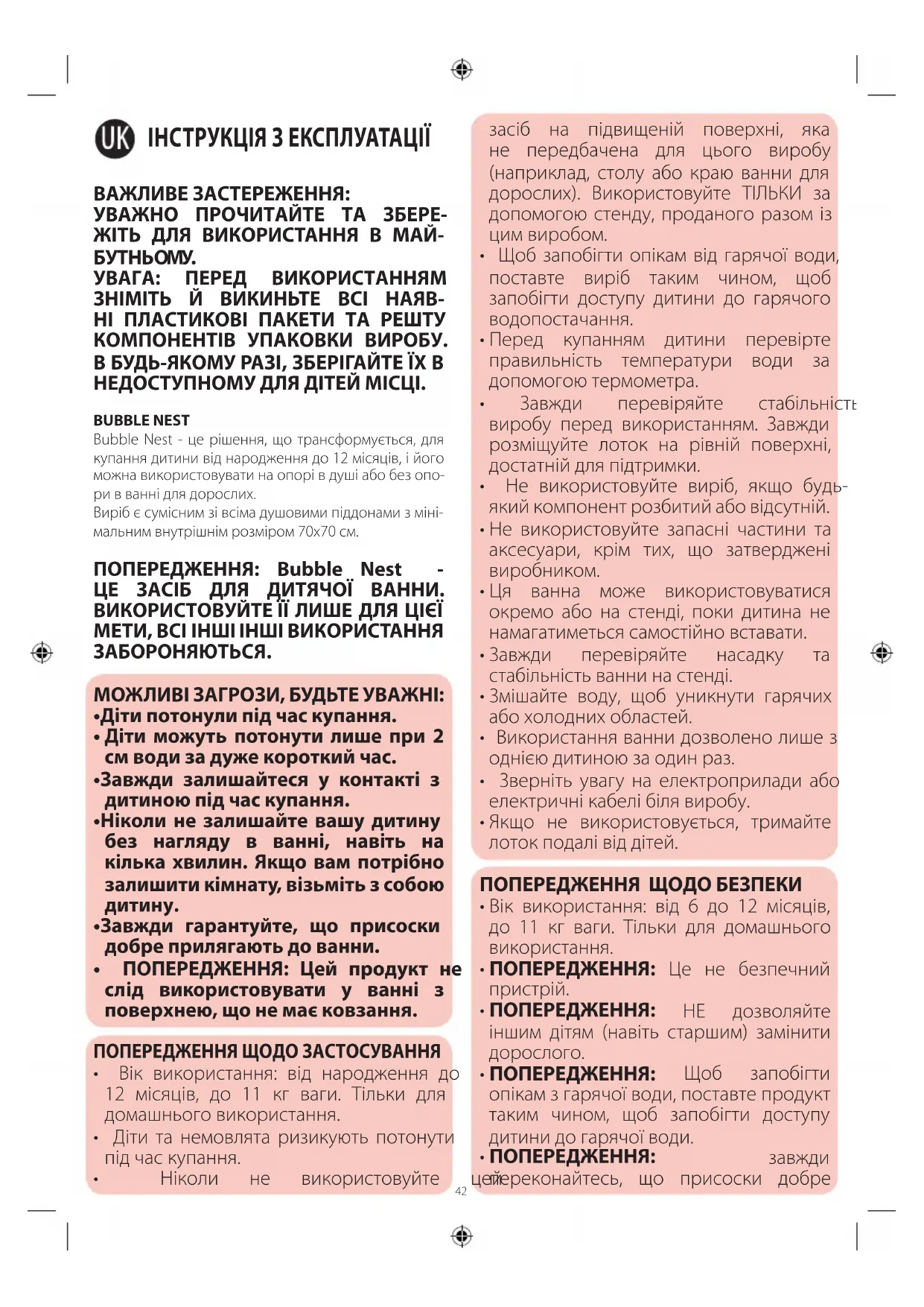 Гарантується відсутність дефектів виробу при нор- мальних умовах використання, передбачених у ін- струкції з експлуатації. Відтак, гарантія не буде діяти в разі ушкоджень, що з'явилися внаслідок неправильної експлуатації, зно- шення або випадкових подій. Про строк дії гарантії відповідності можна дізнатись з відповідних положень чинного національного зако- нодавства країни, в якій придбано виріб, якщо вони передбачені.45 МЕРЫ ПРЕДОСТОРОЖНОСТИ: ВНИМАТЕЛЬНО ПРОЧИТАЙТЕ ИН- СТРУКЦИЮ И СОХРАНИТЕ ЕЕ ДЛЯ ПО- СЛЕДУЮЩИХ КОНСУЛЬТАЦИЙ. ВНИМАНИЕ: ПЕРЕД ИСПОЛЬЗОВА- НИЕМ СНИМИТЕ С ИЗДЕЛИЯ ВСЕ ВОЗ- МОЖНЫЕ ПЛАСТИКОВЫЕ ПАКЕТЫ И ЭЛЕМЕНТЫ УПАКОВКИ И ДЕРЖИТЕ ИХ ВДАЛИ ОТ ДЕТЕЙ. СТУЛ ДЛЯ МЫТЬЯ BUBBLE NEST (БАБЛ НЭСТ) Ванночка Bubble Nest прекрасно подходит для купа- ния ребёнка возрастом от 0 до 12 месяцев. Можно использовать на подставке в душе или без подставки в ванне для взрослых. Совместима со всеми душевыми поддонами с мини- мальными внутренними размерами 70x70 см. ПРЕДУПРЕЖДЕНИЕ: ВАННОЧКА ДЛЯ КУПАНИЯ BUBBLE NEST РАЗРЕШЕНА К ИСПОЛЬЗОВАНИЮ ТОЛЬКО В КАЧЕСТВЕ ДЕТСКОЙ ВАННОЧКИ. ИСПОЛЬЗУЙТЕ ЕЕ ИСКЛЮЧИТЕЛЬНО ДЛЯ ЭТОЙ ЦЕЛИ. ПРЕДУПРЕЖДЕНИЕ: ОПАСНОСТЬ
