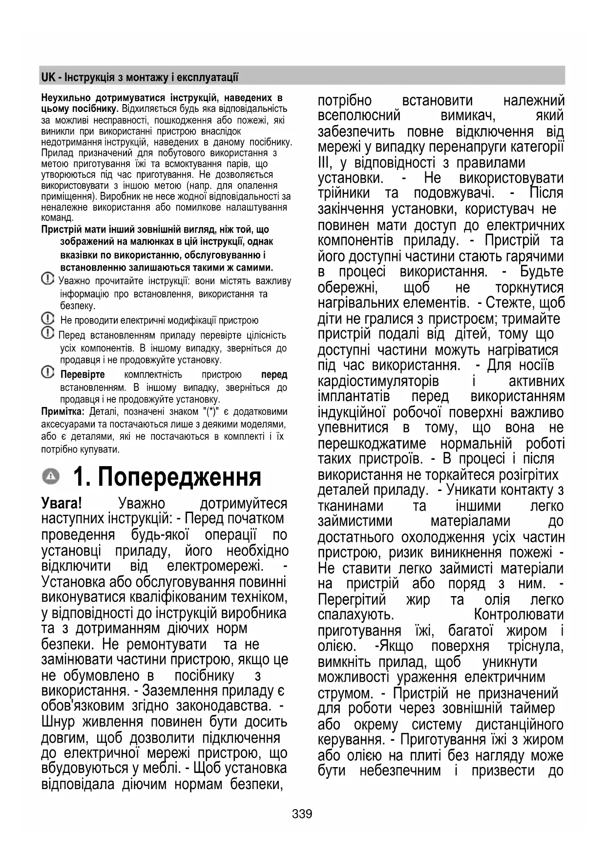 Увага! Уважно дотримуйтеся наступних інструкцій: - Перед початком проведення будь-якої операції по установці приладу, його необхідно відключити від електромережі. - Установка або обслуговування повинні виконуватися кваліфікованим техніком, у відповідності до інструкцій виробника та з дотриманням діючих норм безпеки. Не ремонтувати та не замінювати частини пристрою, якщо це не обумовлено в посібнику з використання. - Заземлення приладу є обов'язковим згідно законодавства. - Шнур живлення повинен бути досить довгим, щоб дозволити підключення до електричної мережі пристрою, що вбудовуються у меблі. - Щоб установка відповідала діючим нормам безпеки, потрібно встановити належний всеполюсний вимикач, який забезпечить повне відключення від мережі у випадку перенапруги категорії III, у відповідності з правилами установки. - Не використовувати трійники та подовжувачі. - Після закінчення установки, користувач не повинен мати доступ до електричних компонентів приладу. - Пристрій та його доступні частини стають гарячими в процесі використання. - Будьте обережні, щоб не торкнутися нагрівальних елементів. - Стежте, щоб діти не гралися з пристроєм; тримайте пристрій подалі від дітей, тому що доступні частини можуть нагріватися під час використання. - Для носіїв кардіостимуляторів і активних імплантатів перед використанням індукційної робочої поверхні важливо упевнитися в тому, що вона не перешкоджатиме нормальній роботі таких пристроїв. - В процесі і після використання не торкайтеся розігрітих деталей приладу. - Уникати контакту з тканинами та іншими легко займистими матеріалами до достатнього охолодження усіх частин пристрою, ризик виникнення пожежі - Не ставити легко займисті матеріали на пристрій або поряд з ним. - Перегрітий жир та олія легко спалахують. Контролювати приготування їжі, багатої жиром і олією. -Якщо поверхня тріснула, вимкніть прилад, щоб уникнути можливості ураження електричним струмом. - Пристрій не призначений для роботи через зовнішній таймер або окрему систему дистанційного керування. - Приготування їжі з жиром або олією на плиті без нагляду може бути небезпечним і призвести до340 пожежі. - Слід контролювати процес приготування. Процес короткострокового приготування потрібно постійно контролювати. - НІКОЛИ не намагайтеся загасити вогонь за допомогою води. Навпаки, вимкнути прилад і загасити полум'я, наприклад, кришкою або протипожежною ковдрою. Небезпека виникнення пожежі: не ставте предмети на варильні поверхні. - Не використовувати парові очищувачі, ризик ураження електричним струмом. - Не ставте металеві предмети, такі як ножі, вилки, ложки та кришки на поверхню, оскільки вони можуть нагріватися. - Перед підключенням приладу до електричної мережі: перевірте табличку з паспортними даними (на нижній частині пристрою), щоб упевнитися, що напруга і потужність відповідають значенням мережі та електричної розетки. У випадку сумнівів звернутися до кваліфікованого електрика. Важливо: - Після використання, вимкніть робочу поверхню через панель управління, не покладаючись на детектор кухонного посуду. - Уникати розливу рідини, тому під час кип'ятіння або розігріву рідин зменшуйте подачу тепла. - Не залишати елементи нагрівання увімкненими з порожніми каструлями або сковорідками або без них. - По завершенню приго