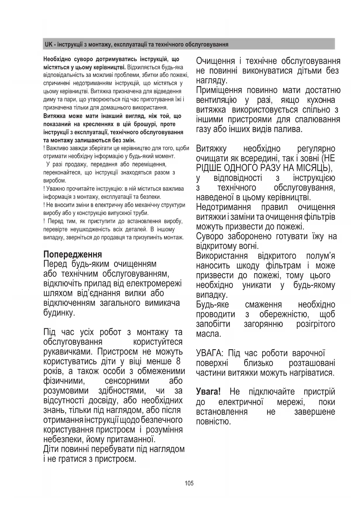 Приміщення повинно мати достатню вентиляцію у разі, якщо кухонна витяжка використовується спільно з іншими пристроями для спалювання газу або інших видів палива. Витяжку необхідно регулярно очищати як всередині, так і зовні (НЕ РІДШЕ ОДНОГО РАЗУ НА МІСЯЦЬ), у відповідності з інструкцією з технічного обслуговування, наведеної в цьому керівництві. Недотримання правил очищення витяжки і заміни та очищення фільтрів можуть призвести до пожежі. Суворо заборонено готувати їжу на відкритому вогні. Використання відкритого полум’я наносить шкоду фільтрам і може призвести до пожежі, тому цього необхідно уникати у будь-якому