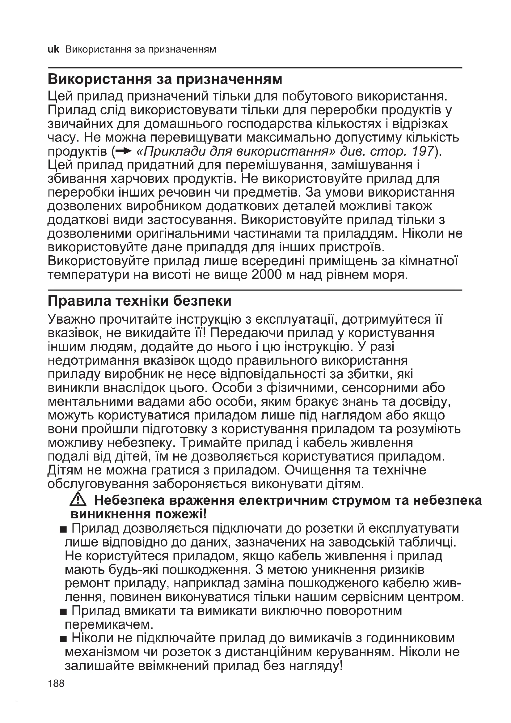 - Спеціальні приладдя W Небезпека задушення! Не дозволяйте дітям гратися з пакувальним матеріалом. W Увага! Рекомендується ні в якому разі не залишати прилад ввімкненим довше, ніж це потрібно для переробки продуктів. Не вмикайте прилад вхолосту. W Важливо! Після кожного використання, а також після тривалого невикористання прилад необхідно очищати (X«Очищенняі догляд»див.стор.195). W Пояснення символів на приладі або приладді p. 199