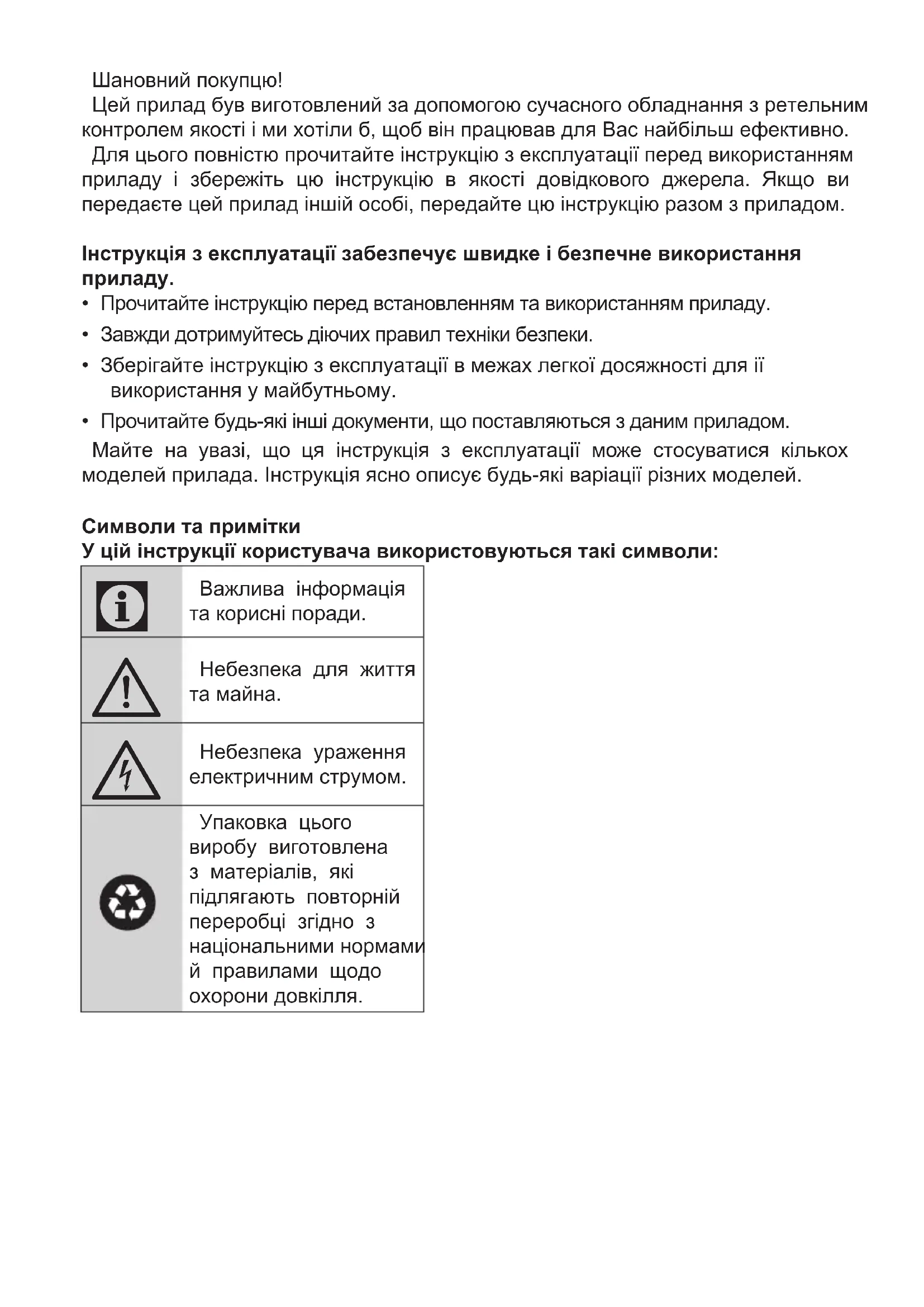 - Прочитайте будь-які інші документи, що поставляються з даним приладом. Майте на увазі, що ця інструкція з експлуатації може стосуватися кількох моделей прилада. Інструкція ясно описує будь-які варіації різних моделей. Символи та примітки У цій інструкції користувача використовуються такі символи: