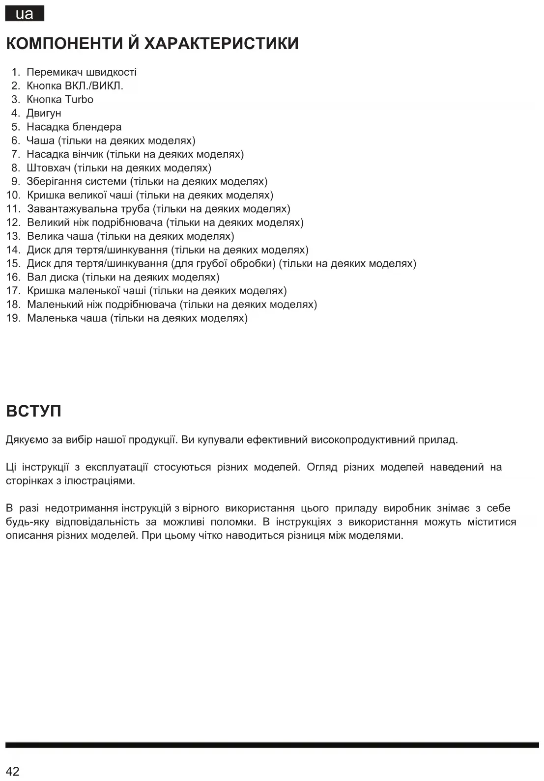 Дякуємо за вибір нашої продукції. Ви купували ефективний високопродуктивний прилад. Ці інструкції з експлуатації стосуються різних моделей. Огляд різних моделей наведений на сторінках з ілюстраціями. В разі недотримання інструкцій з вірного використання цього приладу виробник знімає з себе будь-яку відповідальність за можливі поломки. В інструкціях з використання можуть міститися описання різних моделей. При цьому чітко наводиться різниця між моделями.43