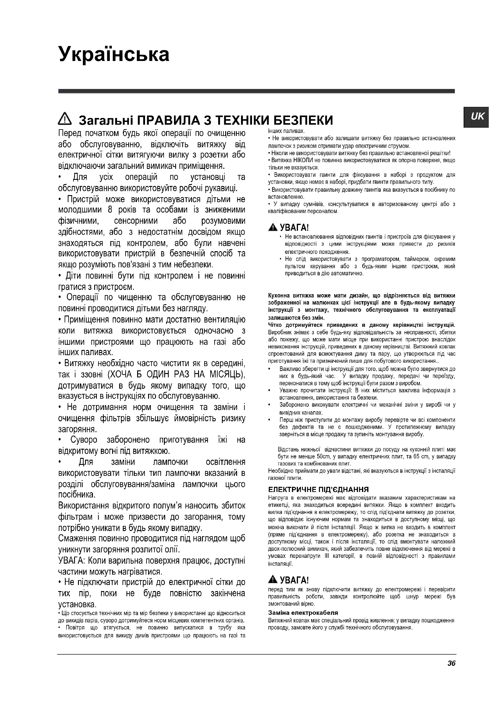 Загальні ПРАВИЛА З ТЕХНІКИ БЕЗПЕКИ Перед початком будь якої операції по очищенню або обслуговуванню, відключіть витяжку від електричної сітки витягуючи вилку з розетки або відключаючи загальний вимикач приміщення.