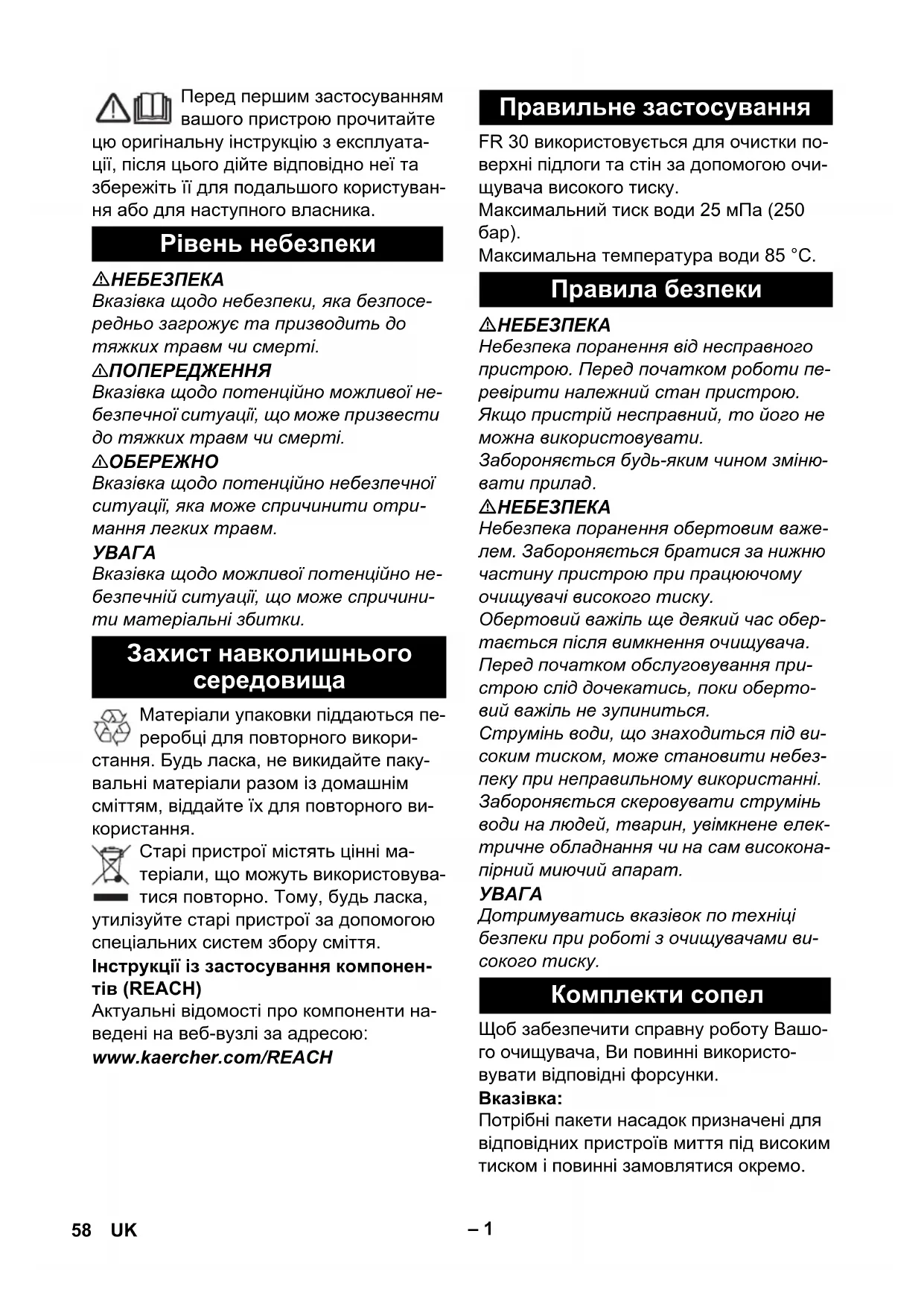 Вказівка щодо можливої потенційно не- безпечній ситуації, що може спричини- ти матеріальні збитки. Матеріали упаковки піддаються пе- реробці для повторного викори- стання. Будь ласка, не викидайте паку- вальні матеріали разом із домашнім сміттям, віддайте їх для повторного ви- користання. Старі пристрої містять цінні ма- теріали, що можуть використовува- тися повторно. Тому, будь ласка, утилізуйте старі пристрої за допомогою спеціальних систем збору сміття. Інструкції із застосування компонен- тів (REACH) Актуальні відомості про компоненти на- ведені на веб-вузлі за адресою: www.kaercher.com/REACH FR 30 використовується для очистки по- верхні підлоги та стін за допомогою очи- щувача високого тиску. Максимальний тиск води 25 мПа (250