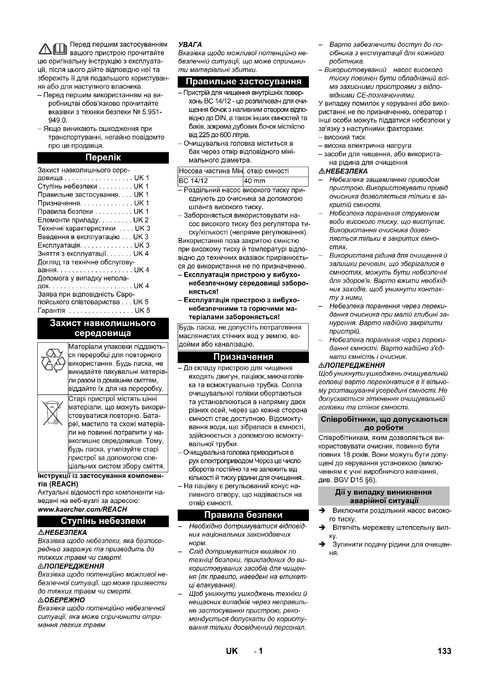 Матеріали упаковки піддають- ся переробці для повторного використання. Будь ласка, не викидайте пакувальні матеріа- ли разом із домашнім сміттям, віддайте їх для на переробку. Старі пристрої містять цінні матеріали, що можуть викори- стовуватися повторно. Бата- реї, мастило та схожі матеріа- ли не повинні потрапити у на- вколишнє середовище. Тому, будь ласка, утилізуйте старі пристрої за допомогою спе- ціальних систем збору сміття. Ступінь небезпеки Правильне застосування Носова частина Мін. отвір ємності BC 14/12 40 mm Будь ласка, не допустіть потрапляння маслянистих стічних вод у землю, во- дойми або каналізацію. Призначення Правила безпеки Співробітники, що допускаються