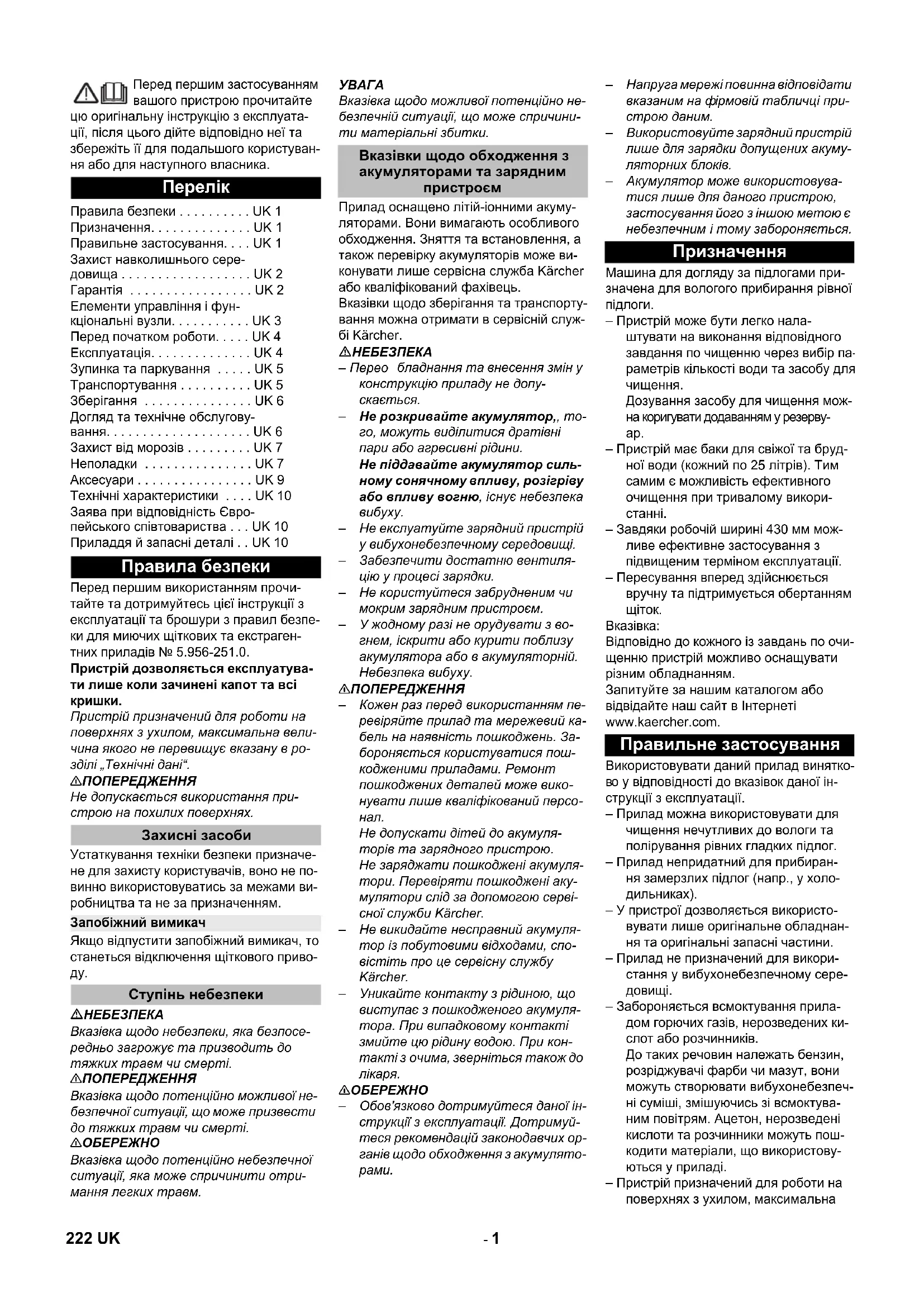 Призначення Правильне застосування 222 UK- 2 величина якого вказана в розділі „Технічні дані". – Цей пристрій придатний для проми- слового застосування, наприклад, в готелях, школах, лікарнях, на фабри- ках, у магазинах, офісах та орендних підприємствах. – Пристрій був розроблений для мийки підлог усередині приміщень або по- верхонь, що перебувають під дахом. – Діапазон робочих температур ле- жить між +5С і +40С. Інструкції із застосування компонен- тів (REACH) Актуальні відомості про компоненти на- ведені на веб-вузлі за адресою: www.kaercher.de/REACH У кожній країні діють умови гарантії, що надається нашою відповідальною фір- мою-продавцем. Неполадки в роботі ва- шого обладнання ми усуваємо безкош- товно протягом терміну дії гарантії, якщо вони викликані браком матеріалу або ви- робничим браком. У гарантійному випад- ку звертайтесь, будь ласка, з документа- ми, що підтверджують покупку при- строю, до вашого торгового агента або до наведених нижче пунктів гарантійного обслуговування клієнтів. Захист навколишнього