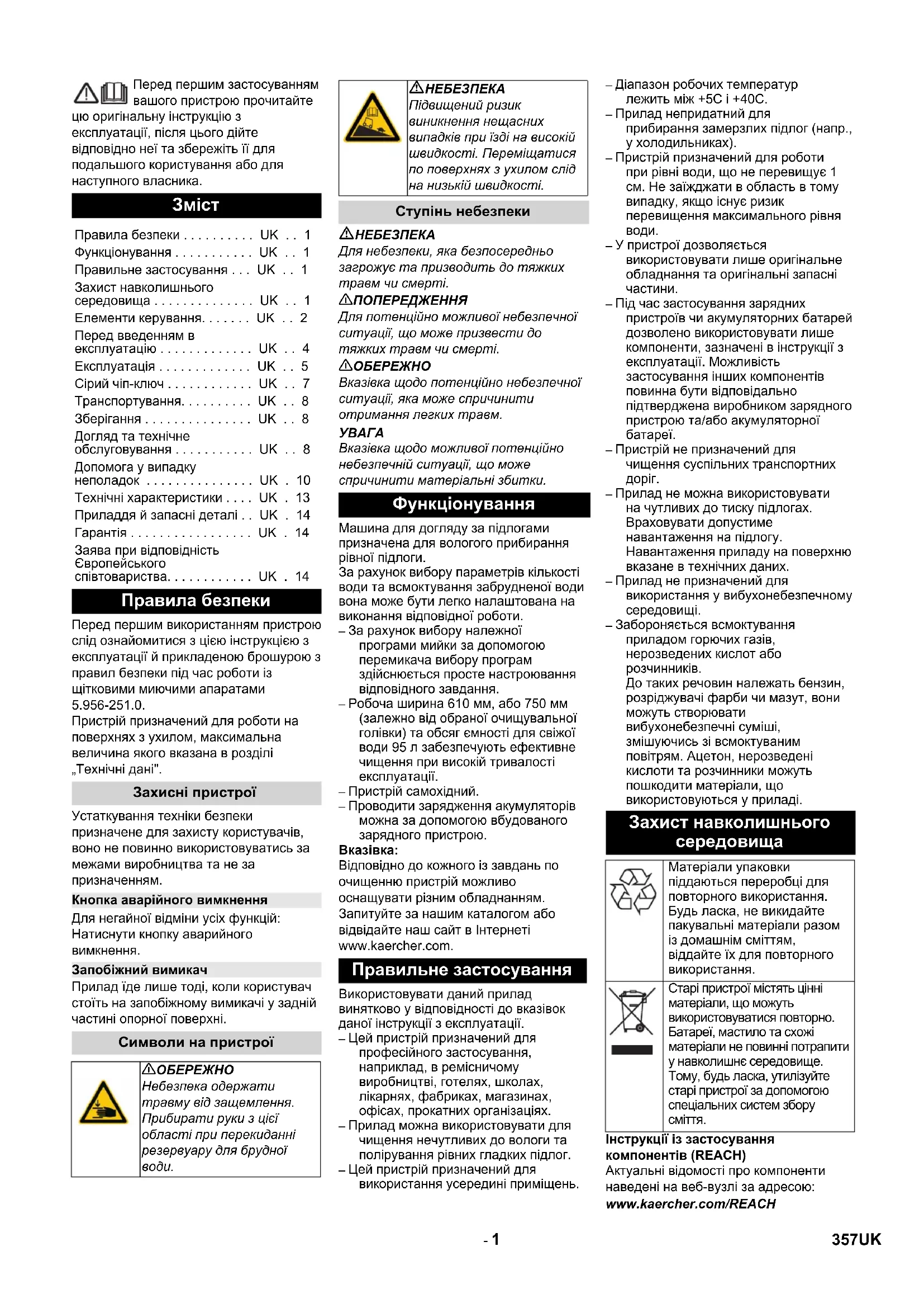Chairman of the Board of Management Director Regulatory Affairs & Certification 356 LT- 1 Перед першим застосуванням вашого пристрою прочитайте цю оригінальну інструкцію з експлуатації, після цього дійте відповідно неї та збережіть її для подальшого користування або для наступного власника. Перед першим використанням пристрою слід ознайомитися з цією інструкцією з експлуатації й прикладеною брошурою з правил безпеки під час роботи із щітковими миючими апаратами 5.956-251.0. Пристрій призначений для роботи на поверхнях з ухилом, максимальна величина якого вказана в розділі „Технічні дані". Устаткування техніки безпеки призначене для захисту користувачів, воно не повинно використовуватись за межами виробництва та не за призначенням. Для негайної відміни усіх функцій: Натиснути кнопку аварийного