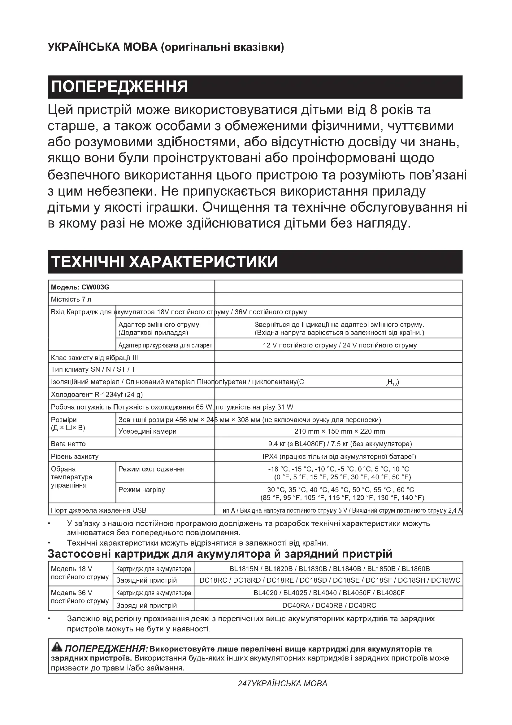 - Залежно від регіону проживання деякі з перелічених вище акумуляторних картриджів та зарядних пристроїв можуть не бути у наявності. ПОПЕРЕДЖЕННЯ: Використовуйте лише перелічені вище картриджі для акумуляторів та зарядних пристроїв. Використання будь-яких інших акумуляторних картриджів і зарядних пристроїв може призвести до травм і/або займання.248 УКРАЇНСЬКА МОВА