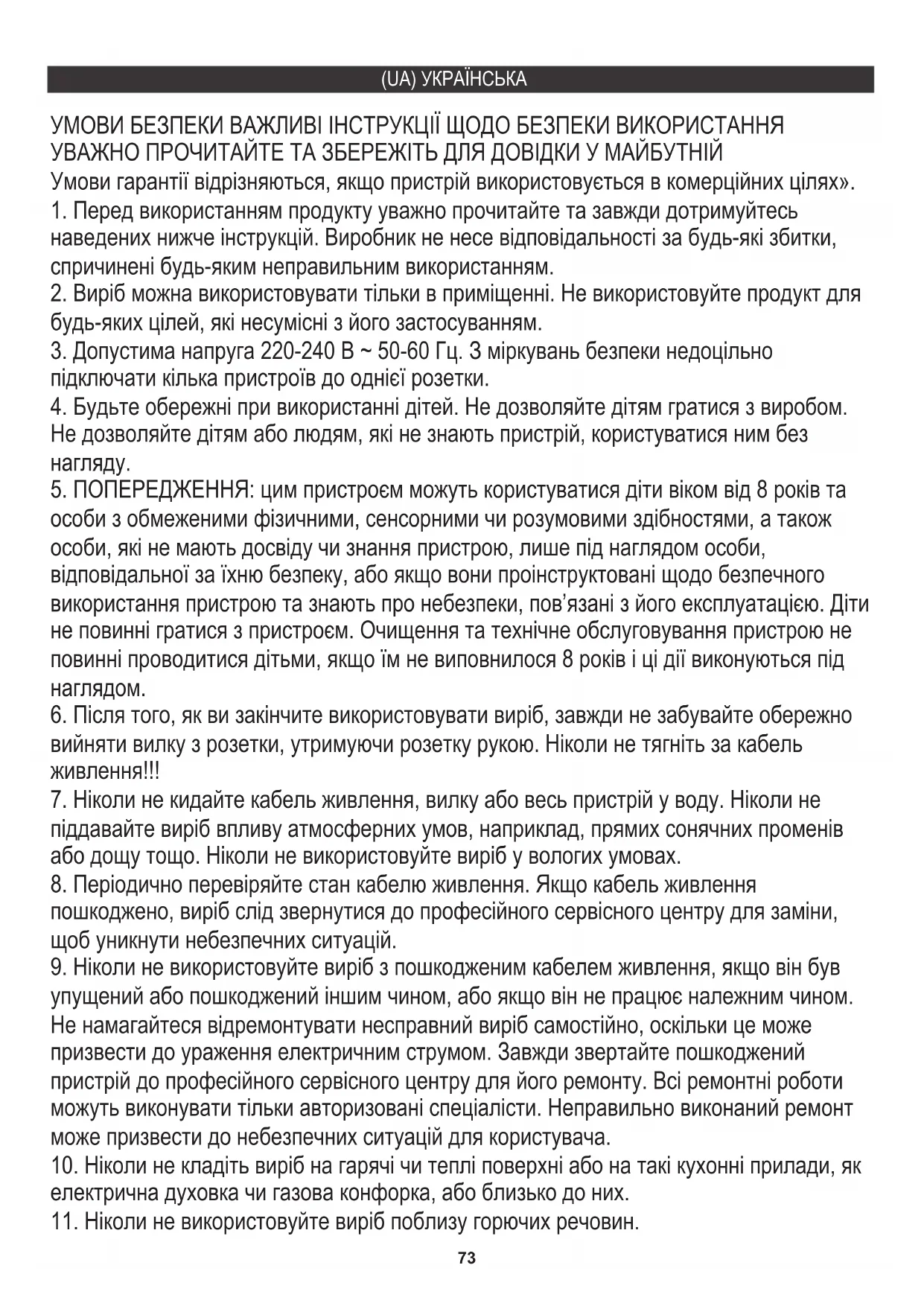 упущений або пошкоджений іншим чином, або якщо він не працює належним чином. Не намагайтеся відремонтувати несправний виріб самостійно, оскільки це може призвести до ураження електричним струмом. Завжди звертайте пошкоджений пристрій до професійного сервісного центру для його ремонту. Всі ремонтні роботи можуть виконувати тільки авторизовані спеціалісти. Неправильно виконаний ремонт може призвести до небезпечних ситуацій для користувача. (UA) УКРАЇНСЬКА74