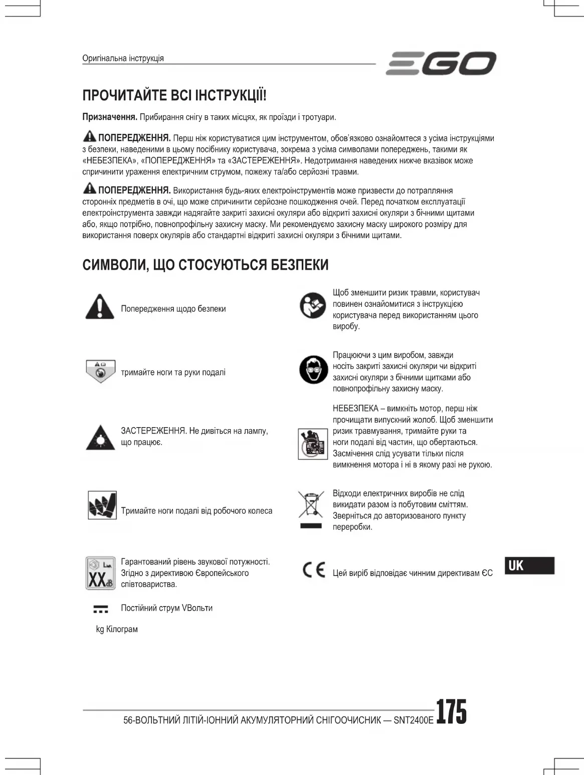 Гарантований рівень звукової потужності. Згідно з директивою Європейського співтовариства.Цей виріб відповідає чинним директивам ЄСПостійний струм V Вольтиkg КілограмОригінальна інструкція56-ВОЛЬТНИЙ ЛІТІЙ-ІОННИЙ АКУМУЛЯТОРНИЙ СНІГООЧИСНИК — SNT2400E176