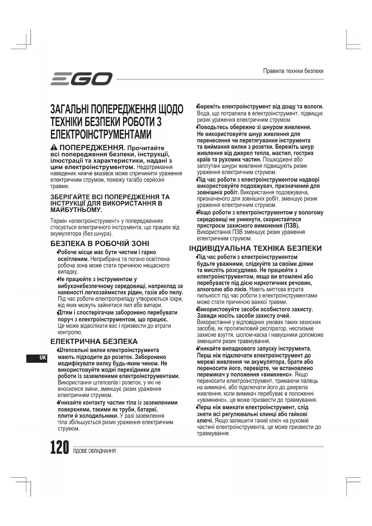 Якщо виникають ситуації, які не розглядаються в цьому посібнику, проявляйте обережність і розсудливість. Зверніться до клієнтської служби EGO по допомогу.
