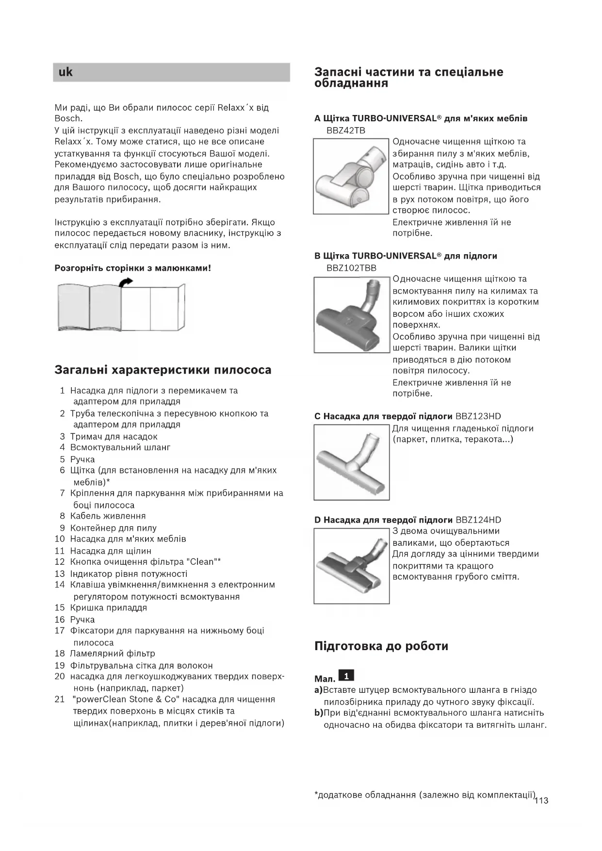 екомендуємо застосовувати лише оригінальне приладдя від Bosch, що було спеціально розроблено для Вашого пилососу, щоб досягти найкращих результатів прибирання. Інструкцію з експлуатації потрібно зберігати. Якщо
