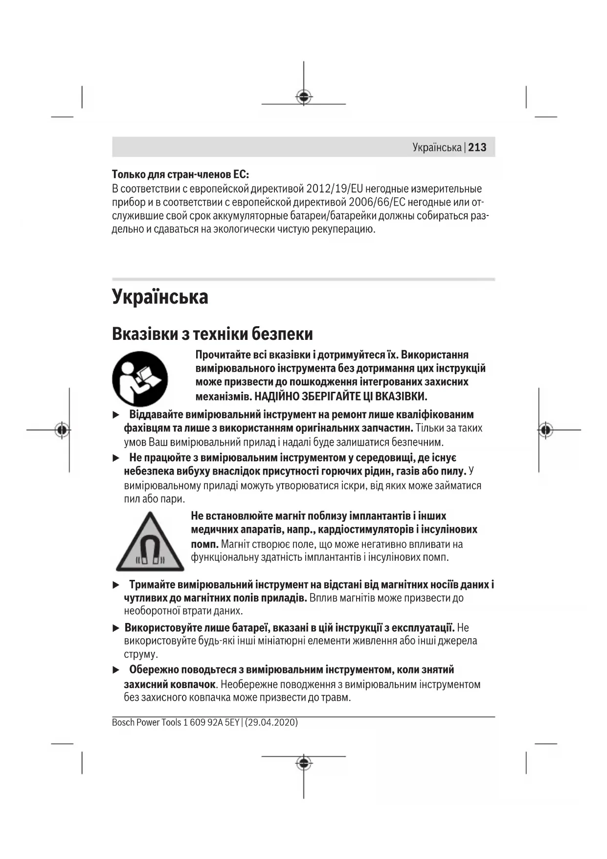 Лише для країнЄС: Відповідно до європейської директиви 2012/19/EU вимірювальні інструменти, що вийшли із вживання, та відповідно до європейської директиви 2006/66/EC пошкоджені або відпрацьовані акумуляторні батареї/батарейки повинні здаватися окремо і утилізуватися екологічно чистим способом. 1 609 92A 5EY | (29.04.2020) Bosch Power ToolsҚазақ | 225