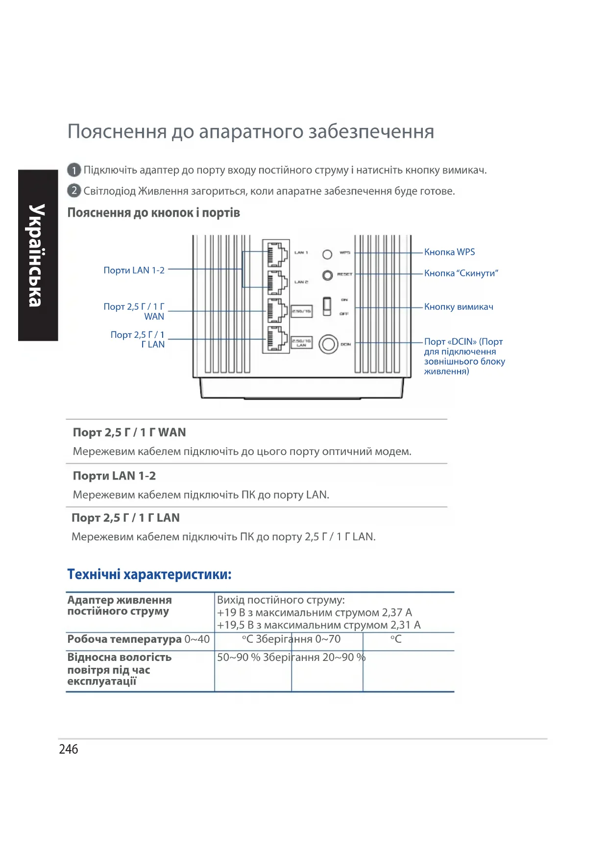 Відносна вологість повітря під час експлуатації50~90 % Зберігання 20~90 % Технічні характеристики: Порти LAN 1-2Порт 2,5 Г / 1 Г WAN Порт 2,5 Г / 1 Г LANКнопка WPSКнопка “Скинути”Кнопку вимикачПорт «DCIN» (Порт для підключення зовнішнього блоку живлення) Порт 2,5 Г / 1 Г LAN Мережевим кабелем підключіть ПК до порту 2,5 Г / 1 Г LAN.247
