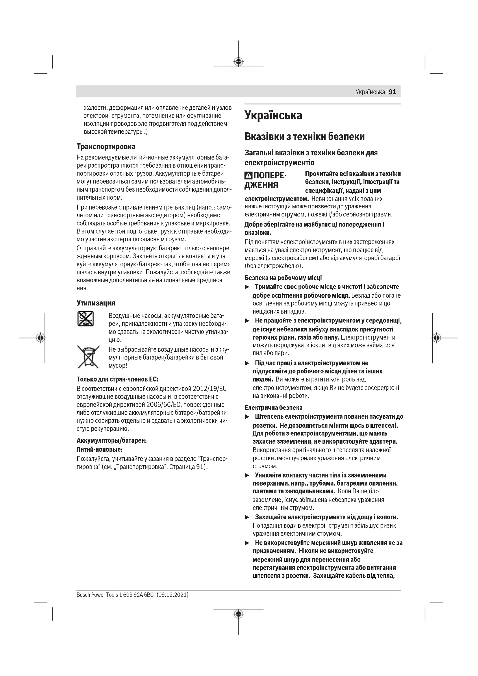 Повітряні насоси, акумуляторні батареї, приладдя і упаковку треба здавати на екологічно чисту повторну переробку. Не викидайте повітряні насоси та акумулятори/батареї в побутове сміття! Лише для країнЄС: Відповідно до європейської Директиви 2012/19/EU повітряні насоси, що вийшли із вживання, та відповідно до європейської Директиви 2006/66/EC пошкоджені або відпрацьовані акумуляторні батареї/батарейки повинні здаватися окремо і утилізуватися екологічно чистим