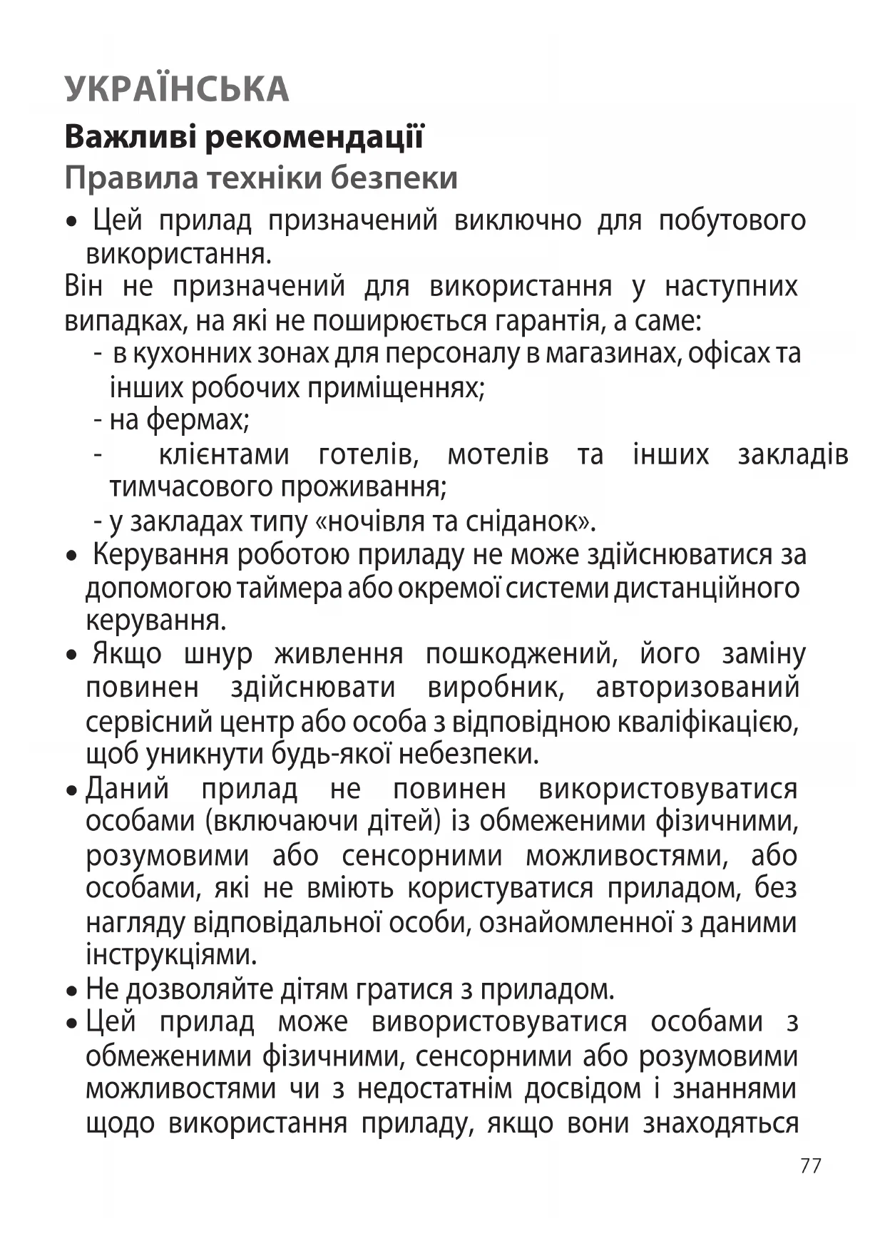 - Цей прилад призначений виключно для побутового використання. Він не призначений для використання у наступних випадках, на які не поширюється гарантія, а саме: - в кухонних зонах для персоналу в магазинах, офісах та інших робочих приміщеннях; - на фермах; - клієнтами готелів, мотелів та інших закладів тимчасового проживання; - у закладах типу «ночівля та сніданок».