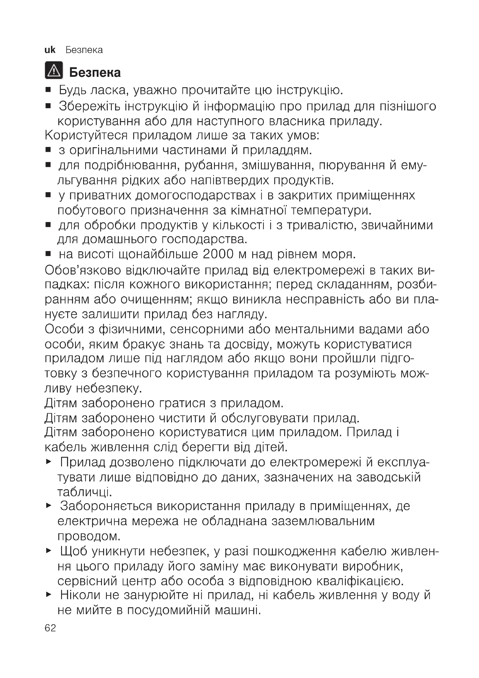 ¡ Будь ласка, уважно прочитайте цю інструкцію. ¡ Збережіть інструкцію й інформацію про прилад для пізнішого користування або для наступного власника приладу. Користуйтеся приладом лише за таких умов: ¡ з оригінальними частинами й приладдям. ¡ для подрібнювання, рубання, змішування, пюрування й ему- льгування рідких або напівтвердих продуктів. ¡ у приватних домогосподарствах і в закритих приміщеннях побутового призначення за кімнатної температури. ¡ для обробки продуктів у кількості і з тривалістю, звичайними для домашнього господарства. ¡ на висоті щонайбільше 2000м над рівнем моря. Обов’язково відключайте прилад від електромережі в таких ви- падках: після кожного використання; перед складанням, розби- ранням або очищенням; якщо виникла несправність або ви пла- нуєте залишити прилад без нагляду. Особи з фізичними, сенсорними або ментальними вадами або особи, яким бракує знань та досвіду, можуть користуватися приладом лише під наглядом або якщо вони пройшли підго- товку з безпечного користування приладом та розуміють мож- ливу небезпеку. Дітям заборонено гратися з приладом. Дітям заборонено чистити й обслуговувати прилад. Дітям заборонено користуватися цим приладом. Прилад і кабель живлення слід берегти від дітей. ▶ Прилад дозволено підключати до електромережі й експлуа- тувати лише відповідно до даних, зазначених на заводській