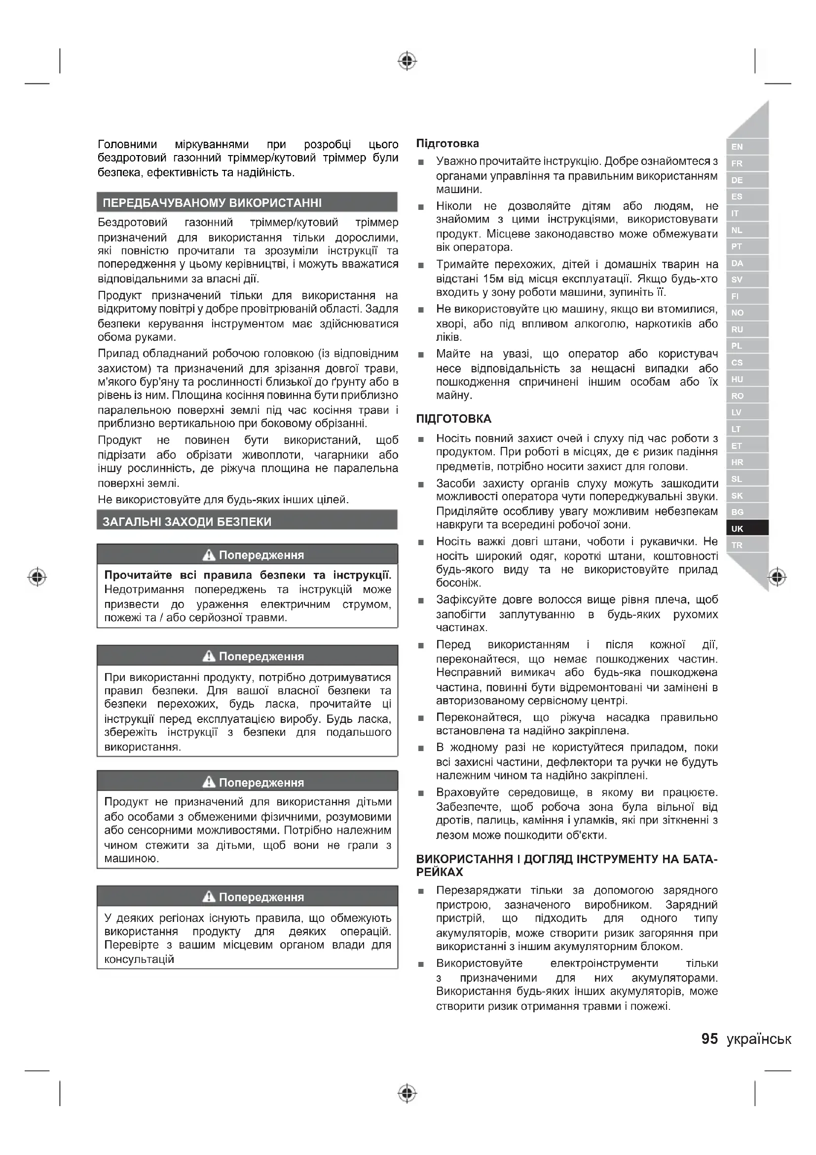 Головними міркуваннями при розробці цього бездротовий газонний тріммер/кутовий тріммер були безпека, ефективність та надійність. ПЕРЕДБАЧУВАНОМУ ВИКОРИСТАННІ Бездротовий газонний тріммер/кутовий тріммер призначений для використання тільки дорослими, які повністю прочитали та зрозуміли інструкції та попередження у цьому керівництві, і можуть вважатися відповідальними за власні дії. Продукт призначений тільки для використання на відкритому повітрі у добре провітрюваній області. Задля безпеки керування інструментом має здійснюватися обома руками. Прилад обладнаний робочою головкою (із відповідним захистом) та призначений для зрізання довгої трави, м'якого бур'яну та рослинності близької до ґрунту або в рівень із ним. Площина косіння повинна бути приблизно паралельною поверхні землі під час косіння трави і приблизно вертикальною при боковому обрізанні. Продукт не повинен бути використаний, щоб підрізати або обрізати живоплоти, чагарники або іншу рослинність, де ріжуча площина не паралельна поверхні землі. Не використовуйте для будь-яких інших цілей. ЗАГАЛЬНІ ЗАХОДИ БЕЗПЕКИ Попередження Прочитайте всі правила безпеки та інструкції. Недотримання попереджень та інструкцій може призвести до ураження електричним струмом, пожежі та / або серйозної травми. Попередження При використанні продукту, потрібно дотримуватися правил безпеки. Для вашої власної безпеки та безпеки перехожих, будь ласка, прочитайте ці інструкції перед експлуатацією виробу. Будь ласка, збережіть інструкції з безпеки для подальшого використання. Попередження Продукт не призначений для використання дітьми або особами з обмеженими фізичними, розумовими або сенсорними можливостями. Потрібно належним чином стежити за дітьми, щоб вони не грали з
