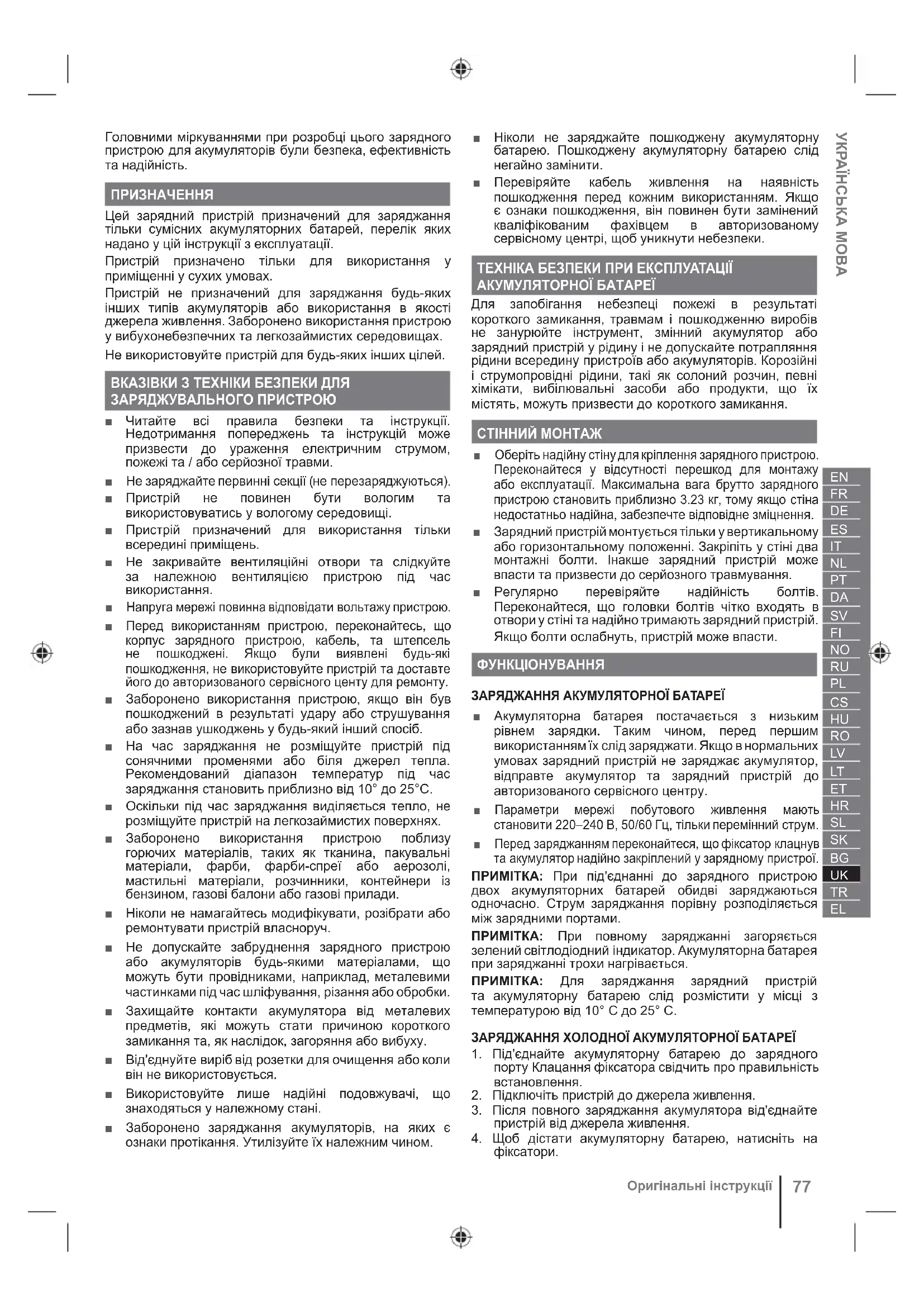 Превод от оригиналните инструкцииГоловними міркуваннями при розробці цього зарядного пристрою для акумуляторів були безпека, ефективність та надійність. ПРИЗНАЧЕННЯ Цей зарядний пристрій призначений для заряджання тільки сумісних акумуляторних батарей, перелік яких надано у цій інструкції з експлуатації. Пристрій призначено тільки для використання у приміщенні у сухих умовах. Пристрій не призначений для заряджання будь-яких інших типів акумуляторів або використання в якості джерела живлення. Заборонено використання пристрою у вибухонебезпечних та легкозаймистих середовищах. Не використовуйте пристрій для будь-яких інших цілей. ВКАЗІВКИ З ТЕХНІКИ БЕЗПЕКИ ДЛЯ ЗАРЯДЖУВАЛЬНОГО ПРИСТРОЮ ■ Читайте всі правила безпеки та інструкції. Недотримання попереджень та інструкцій може призвести до ураження електричним струмом, пожежі та / або серйозної травми. ■ Не заряджайте первинні секції (не перезаряджуються). ■ Пристрій не повинен бути вологим та використовуватись у вологому середовищі. ■ Пристрій призначений для використання тільки всередині приміщень. ■ Не закривайте вентиляційні отвори та слідкуйте за належною вентиляцією пристрою під час використання. ■ Напруга мережі повинна відповідати вольтажу пристрою. ■ Перед використанням пристрою, переконайтесь, що корпус зарядного пристрою, кабель, та штепсель не пошкоджені. Якщо були виявлені будь-які пошкодження, не використовуйте пристрій та доставте його до авторизованого сервісного центу для ремонту. ■ Заборонено використання пристрою, якщо він був пошкоджений в результаті удару або струшування або зазнав ушкоджень у будь-який інший спосіб. ■ На час заряджання не розміщуйте пристрій під сонячними променями або біля джерел тепла. Рекомендований діапазон температур під час заряджання становить приблизно від 10° до 25°C. ■ Оскільки під час заряджання виділяється тепло, не розміщуйте пристрій на легкозаймистих поверхнях. ■ Заборонено використання пристрою поблизу горючих матеріалів, таких як тканина, пакувальні матеріали, фарби, фарби-спреї або аерозолі, мастильні матеріали, розчинники, контейнери із бензином, газові балони або газові прилади. ■ Ніколи не намагайтесь модифікувати, розібрати або ремонтувати пристрій власноруч. ■ Не допускайте забруднення зарядного пристрою або акумуляторів будь-якими матеріалами, що можуть бути провідниками, наприклад, металевими частинками під час шліфування, різання або обробки. ■ Захищайте контакти акумулятора від металевих предметів, які можуть стати причиною короткого замикання та, як наслідок, загоряння або вибуху. ■ Від'єднуйте виріб від розетки для очищення або коли він не використовується. ■ Використовуйте лише надійні подовжувачі, що знаходяться у належному стані. ■ Заборонено заряджання акумуляторів, на яких є ознаки протікання. Утилізуйте їх належним чином. ■ Ніколи не заряджайте пошкоджену акумуляторну батарею. Пошкоджену акумуляторну батарею слід негайно замінити. ■ Перевіряйте кабель живлення на наявність пошкодження перед кожним використанням. Якщо є ознаки пошкодження, він повинен бути замінений кваліфікованим фахівцем в авторизованому сервісному центрі, щоб уникнути небезпеки. ТЕХНІКА БЕЗПЕКИ ПРИ ЕКСПЛУАТАЦІЇ АКУМУЛЯТОРНОЇ БАТАРЕЇ Для запобігання небезпеці пожежі в результаті короткого зам
