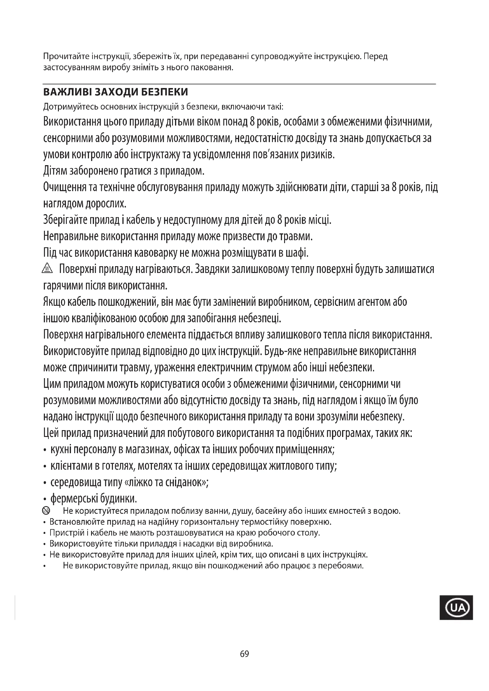 За да се избегнат екологични и здравни проблеми поради наличие на опасни субстанции, уредите, акумулаторните и неакумулаторните батерии, обозначени с един от тези символи, не трябва да се изхвърлят заедно с несортирани общински отпадъци. Винаги изхвърляйте електрически и електронни продукти и, където е приложимо, акумулаторни и неакумулаторни батерии, на подходящо официално място за рециклиране/събиране.69 Прочитайте інструкції, збережіть їх, при передаванні супроводжуйте інструкцією. Перед застосуванням виробу зніміть з нього паковання. ВАЖЛИВІ ЗАХОДИ БЕЗПЕКИ Дотримуйтесь основних інструкцій з безпеки, включаючи такі: Використання цього приладу дітьми віком понад 8 років, особами з обмеженими фізичними, сенсорними або розумовими можливостями, недостатністю досвіду та знань допускається за умови контролю або інструктажу та усвідомлення пов’язаних ризиків. Дітям заборонено гратися з приладом. Очищення та технічне обслуговування приладу можуть здійснювати діти, старші за 8 років, під наглядом дорослих. Зберігайте прилад і кабель у недоступному для дітей до 8 років місці. Неправильне використання приладу може призвести до травми. Під час використання кавоварку не можна розміщувати в шафі. h Поверхні приладу нагріваються. Завдяки залишковому теплу поверхні будуть залишатися гарячими після використання. Якщо кабель пошкоджений, він має бути замінений виробником, сервісним агентом або іншою кваліфікованою особою для запобігання небезпеці. Поверхня нагрівального елемента піддається впливу залишкового тепла після використання. Використовуйте прилад відповідно до цих інструкцій. Будь-яке неправильне використання може спричинити травму, ураження електричним струмом або інші небезпеки. Цим приладом можуть користуватися особи з обмеженими фізичними, сенсорними чи розумовими можливостями або відсутністю досвіду та знань, під наглядом і якщо їм було надано інструкції щодо безпечного використання приладу та вони зрозуміли небезпеку. Цей прилад призначений для побутового використання та подібних програмах, таких як: