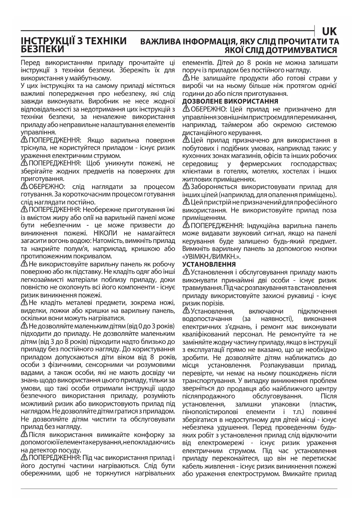 Omistajan opas FIПеред використанням приладу прочитайте ці інструкції з техніки безпеки. Збережіть їх для використання у майбутньому. У цих інструкціях та на самому приладі містяться важливі попередження про небезпеку, які слід завжди виконувати. Виробник не несе жодної відповідальності за недотримання цих інструкцій з техніки безпеки, за неналежне використання приладу або неправильне налаштування елементів управління. ПОПЕРЕДЖЕННЯ: Якщо варильна поверхня тріснула, не користуйтеся приладом - існує ризик ураження електричним струмом. ПОПЕРЕДЖЕННЯ: Щоб уникнути пожежі, не зберігайте жодних предметів на поверхнях для приготування. ОБЕРЕЖНО: слід наглядати за процесом готування. За короткочасним процесом готування слід наглядати постійно. ПОПЕРЕДЖЕННЯ: Необережне приготування їжі із вмістом жиру або олії на варильній панелі може бути небезпечним - це може призвести до виникнення пожежі. НІКОЛИ не намагайтеся загасити вогонь водою: Натомість, вимкніть прилад та накрийте полум’я, наприклад, кришкою або протипожежним покривалом. Не використовуйте варильну панель як робочу поверхню або як підставку. Не кладіть одяг або інші легкозаймисті матеріали поблизу приладу, доки повністю не охолонуть всі його компоненти - існує ризик виникнення пожежі. Не кладіть металеві предмети, зокрема ножі, виделки, ложки або кришки на варильну панель, оскільки вони можуть нагріватися. Не дозволяйте маленьким дітям (від 0 до 3 років) підходити до приладу. Не дозволяйте маленьким дітям (від 3 до 8 років) підходити надто близько до приладу без постійного нагляду. До користування приладом допускаються діти віком від 8 років, особи з фізичними, сенсорними чи розумовими вадами, а також особи, які не мають досвіду чи знань щодо використання цього приладу, тільки за умови, що такі особи отримали інструкції щодо безпечного використання приладу, розуміють можливий ризик або використовують прилад під наглядом. Не дозволяйте дітям гратися з приладом. Не дозволяйте дітям чистити та обслуговувати прилад без нагляду. Після використання вимикайте конфорку за допомогою її елемента керування, не покладаючись на детектор посуду. ПОПЕРЕДЖЕННЯ: Під час використання прилад і його доступні частини нагріваються. Слід бути обережними, щоб не торкнутися нагрівальних елементів. Дітей до 8 років не можна залишати поруч із приладом без постійного нагляду. Не залишайте продукти або готові страви у виробі чи на ньому більше ніж протягом однієї години до або після приготування. ДОЗВОЛЕНЕ ВИКОРИСТАННЯ ОБЕРЕЖНО: Цей прилад не призначено для управління зовнішнім пристроєм для перемикання, наприклад, таймером або окремою системою дистанційного керування. Цей прилад призначено для використання в побутових і подібних умовах, наприклад таких: у кухонних зонах магазинів, офісів та інших робочих середовищ; у фермерських господарствах; клієнтами в готелях, мотелях, хостелах і інших житлових приміщеннях. Забороняється використовувати прилад для інших цілей (наприклад, для опалення приміщень). Цей пристрій не призначений для професійного використання. Не використовуйте прилад поза приміщенням. ПОПЕРЕДЖЕННЯ: Індукційна варильна панель може видавати звуковий сигнал, якщо на панелі керування буде залишено будь-який предмет. Вимкніть варильну панель за допомогою кнопки «УВІМКН./ВИМКН.