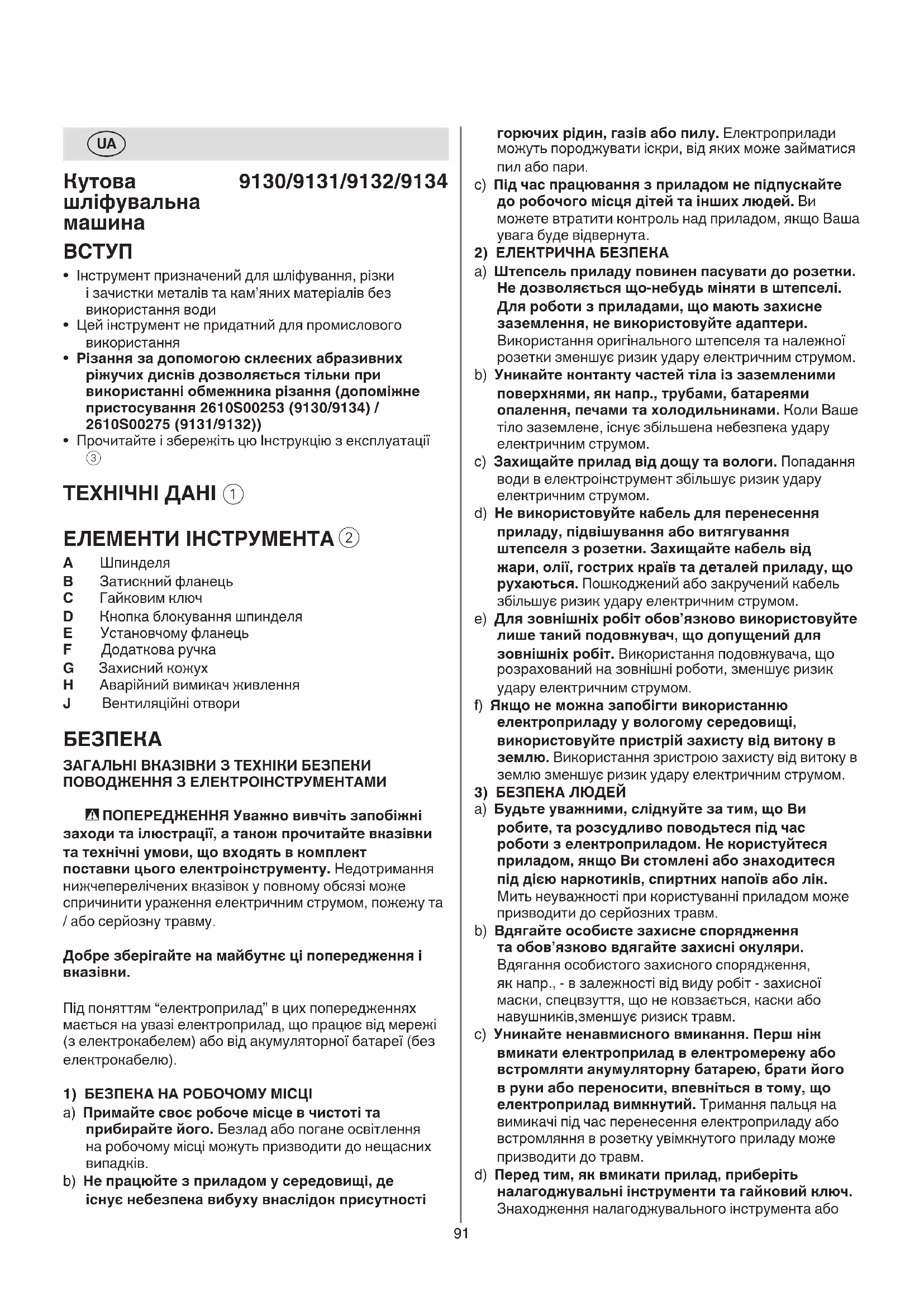 - Різання за допомогою склеєних абразивних ріжучих дисків дозволяється тільки при використанні обмежника різання (допоміжне пристосування 2610S00253 (9130/9134) / 2610S00275 (9131/9132))