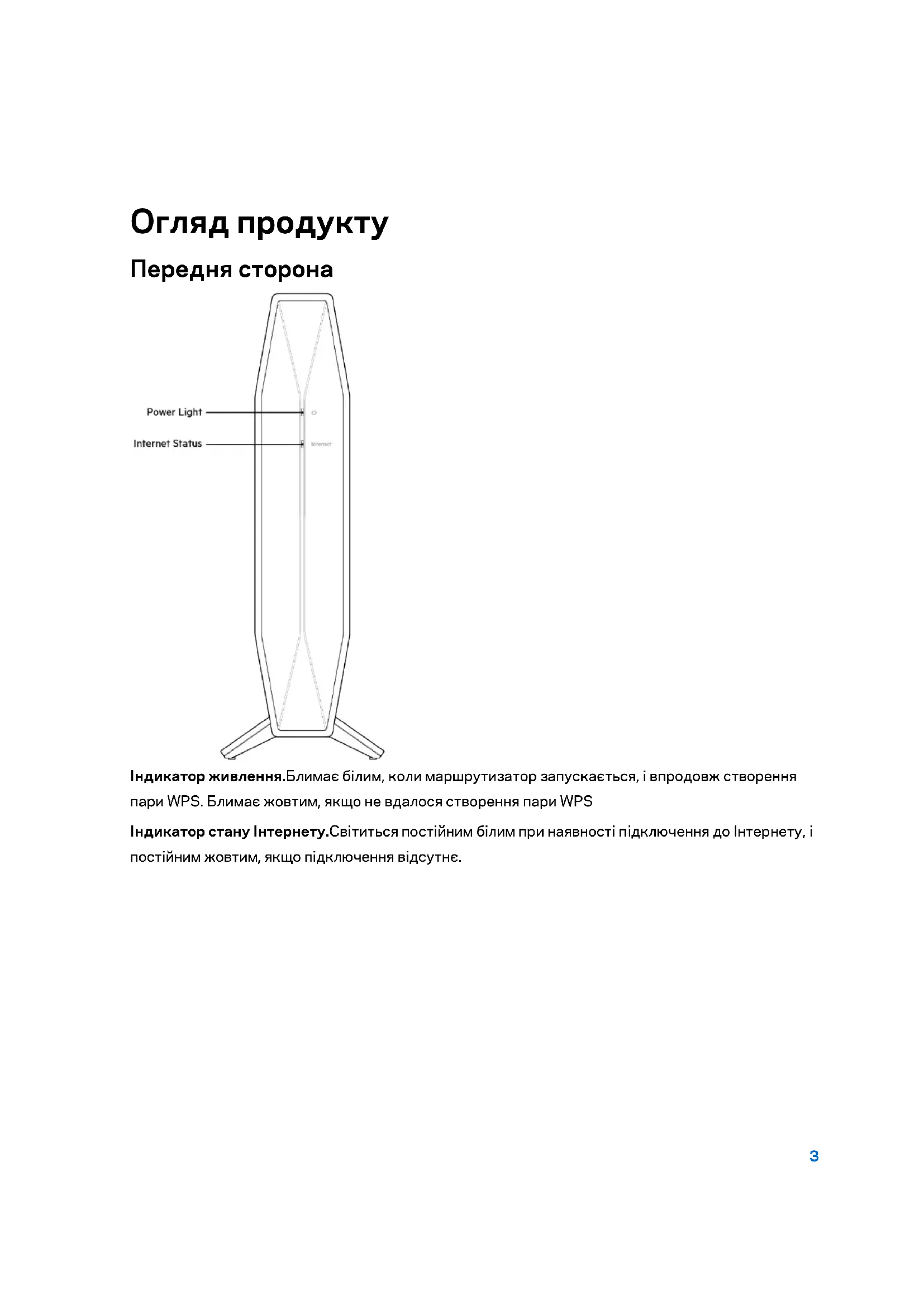 - Екологічний Огляд продукту Передня сторона Індикатор живлення.Блимає білим, коли маршрутизатор запускається, і впродовж створення пари WPS. Блимає жовтим, якщо не вдалося створення пари WPS Індикатор стану Інтернету.Світиться постійним білим при наявності підключення до Інтернету, і постійним жовтим, якщо підключення відсутнє.4 Задня сторона Кнопка «Wi-Fi Protected Setup™» (безпечне налаштування безпровідної мережі) (1).Натисніть цю кнопку для швидкої конфігурації безпеки безпровідної мережі на мережевих пристроях з підтримкою функції безпечного налаштування безпровідної мережі. Лампочка під кнопкою блиматиме білим, доки активне створення пари WPS. Кнопка перезавантаження (Reset) (2).Натисніть та утримуйте, допоки світлодіодний індикатор живлення не розпочне блимати, для повернення пристрою до заводських стандартних налаштувань. Порти Ethernet (3).Приєднайте кабелі Ethernet (також називаються мережевими або Інтернет- кабелями) до цих портів Fast Ethernet (10/100/1000) з маркуванням синього кольору та до інших проводових пристроїв своєї мережі. Лампочка під портом буде засвічуватися лише, коли кабель Ethernet підключений і на кабелі присутній потік даних. Порт Інтернет (4).Приєднайте кабель Ethernet до цього порту та до вашого модему. Лампочка під портом буде засвічуватися лише, коли кабель Ethernet підключений і на кабелі присутній потік даних. Порт USB 3.0 (5). Підключайте та діліться USB-носієм у своїй мережі або в Інтернеті. Порт живлення (6). Підключіть адаптер живлення перемінного струму, що входить до комплекту, до цього порту. Вимикач живлення (7). Натисніть | (увімкн.), щоб увімкнути маршрутизатор.5 Налаштування: Основи Джерела додаткової інформації На додаток до цього посібника користувача можна знайти довідкову інформацію на Belkin.com/support/RT1800 (документація, файли для завантаження, ЧаПи, технічна підтримка, живий чат, форуми) Примітка. Ліцензії та повідомлення щодо стороннього програмного забезпечення, котре застосовується в цьому виробі, можна переглянути за посиланням https://www.belkin.com/support/license/ . Перейдіть, будь ласка, за адресою https://www.belkin.com/support/gplcodecenter/, щоб поставити запитання або подати запити щодо програмного коду універсальної суспільної ліцензії. Порядок інсталяції маршрутизатора Додати цей маршрутизатор до існуючої сітчастої мережі Wi-Fi? Якщо ви використовували цей маршрутизатор раніше, скиньте його до заводських налаштувань перед додаванням його до сітчастої мережі Wi-Fi. Можна зробити це на вкладці Адміністрування в настройках маршрутизатора або натиснувши та утримуючи впродовж 10 секунд кнопку скидання на зворотній стороні маршрутизатора. p. 223