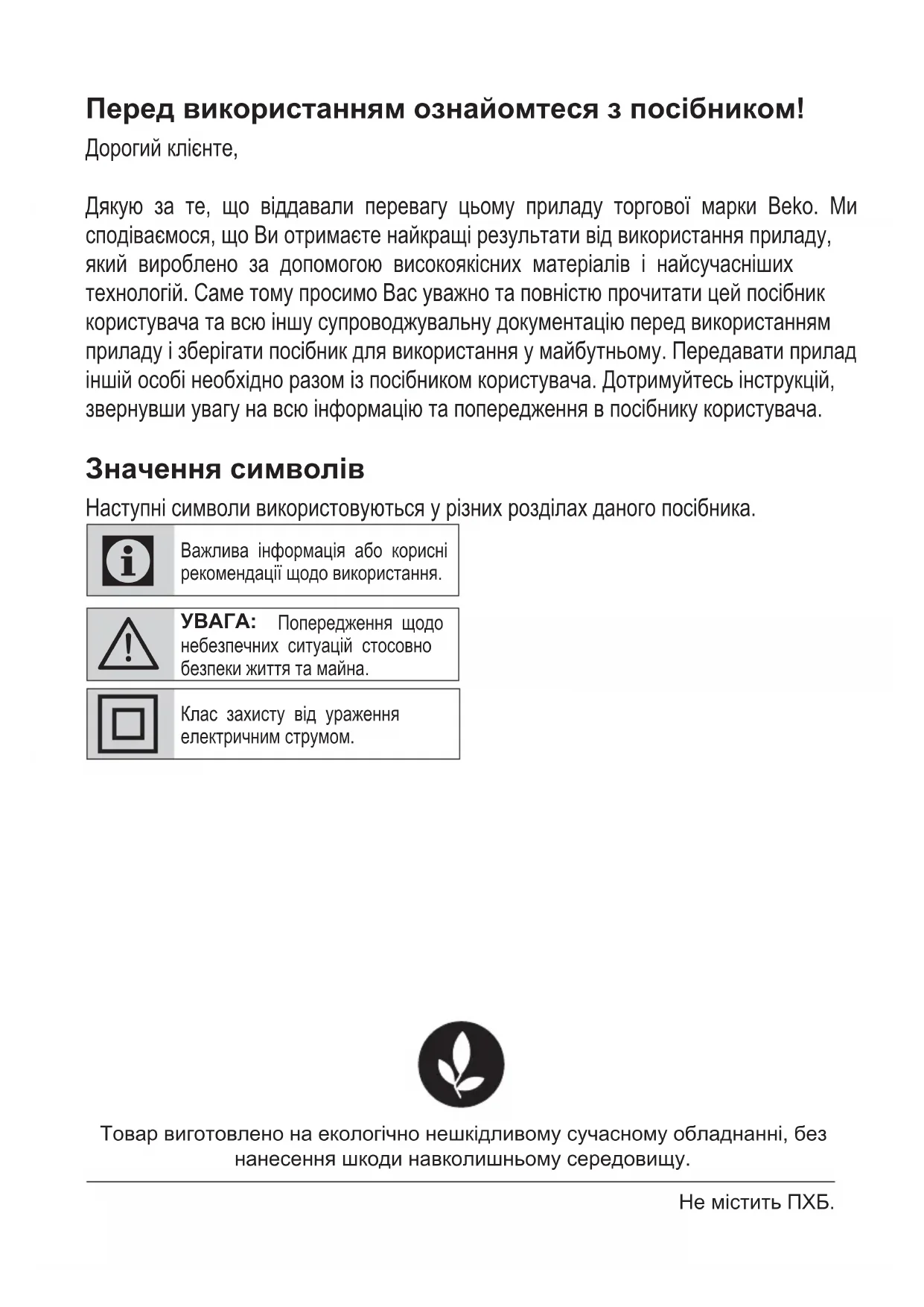 - Доколку ви падне на земја може да престане да работи или да биде трајно оштетен. 4 Чистење и одржувањеПеред використанням ознайомтеся з посібником! Дорогий клієнте, Дякую за те, що віддавали перевагу цьому приладу торгової марки Beko. Ми сподіваємося, що Ви отримаєте найкращі результати від використання приладу, який вироблено за допомогою високоякісних матеріалів і найсучасніших технологій. Саме тому просимо Вас уважно та повністю прочитати цей посібник користувача та всю іншу супроводжувальну документацію перед використанням приладу і зберігати посібник для використання у майбутньому. Передавати прилад іншій особі необхідно разом із посібником користувача. Дотримуйтесь інструкцій, звернувши увагу на всю інформацію та попередження в посібнику користувача. Значення символів Наступні символи використовуються у різних розділах даного посібника.