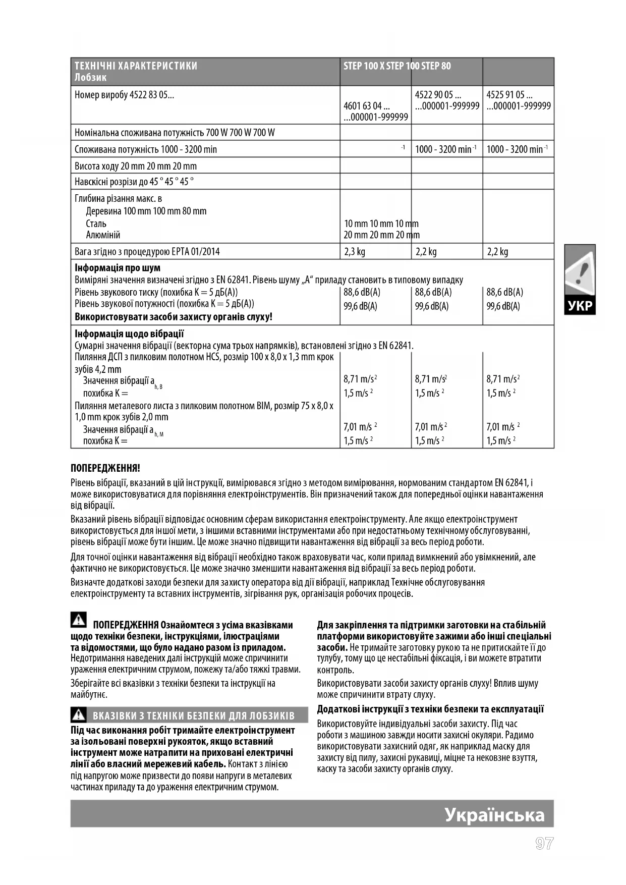 Висота ходу 20 mm 20 mm 20 mm Навскісні розрізи до 45 ° 45 ° 45 ° Глибина різання макс. в Деревина 100 mm 100 mm 80 mm Сталь 10 mm 10 mm 10 mm Алюміній 20 mm 20 mm 20 mm Вага згідно з процедурою EPTA 01/2014 2,3 kg 2,2 kg 2,2 kg Інформація про шум Виміряні значення визначені згідно з EN 62841. Рівень шуму „А“ приладу становить в типовому випадку Рівень звукового тиску (похибка K = 5 дБ(A)) Рівень звукової потужності (похибка K = 5 дБ(A)) Використовувати засоби захисту органів слуху! 88,6 dB(A) 99,6 dB(A) 88,6 dB(A) 99,6 dB(A) 88,6 dB(A) 99,6 dB(A) Інформація щодо вібрації Сумарні значення вібрації (векторна сума трьох напрямків), встановлені згідно з EN 62841. Пиляння ДСП з пилковим полотном HCS, розмір 100 x 8,0 x 1,3 mm крок зубів 4,2 mm Значення вібрації a h, B похибка K = 8,71 m/s