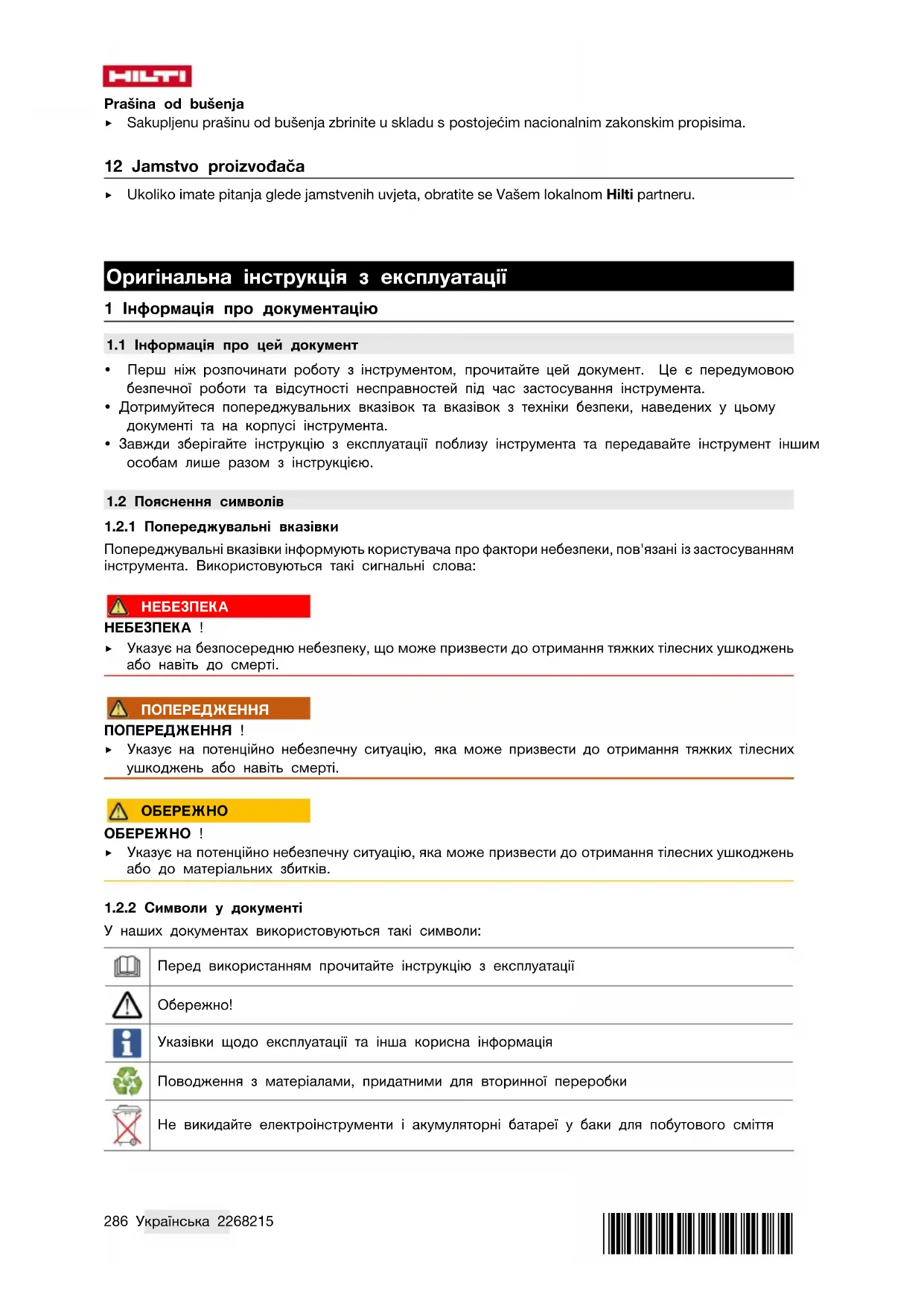 - стор. 297. 11 Утилізація Більшість матеріалів, з яких виготовлено інструменти компанії Hilti, придатні для вторинної пере- робки. Передумовою для їхньої вторинної переробки є належне сортування відходів за типом ма- теріалу. У багатьох країнах світу компанія Hilti приймає старі інструменти для їхньої утилізації. Щоб отримати додаткову інформацію, звертайтеся до сервісної служби компанії Hilti або до свого торго- вого консультанта. Як зазначено у Директиві Європейського союзу щодо норм утилізації старого електричного й електрон- ного устаткування та щодо узгодження цих норм з національним законодавством, електроінструменти, термін служби яких закінчився, необхідно збирати окремо і утилізувати екологічно безпечним способом. ▶ Не викидайте електроінструменти у баки для побутового сміття! Буровий шлам Згідно з нормами охорони довкілля потрапляння бурових відходів у ріки, озера або інші природні водойми без відповідної попередньої обробки є неприпустимим. ▶ Відповідну інформацію та інструкції можна одержати у представників місцевих органів влади. Ми рекомендуємо проводити попередню обробку бурового шламу таким чином: ▶ Зберіть буровий шлам (наприклад, промисловим пилососом для вологого прибирання). ▶ Дайте буровому шламу відстоятися та передайте тверді матеріали на смітник промислових відходів для їхньої подальшої утилізації (додавання флокулянтів прискорює процес відстоювання). ▶ Перш ніж зливати лужну воду (значення pH > 7) у каналізацію, її варто нейтралізувати додаванням кислих реагентів або розбавити великою кількістю води. Буровий пил ▶ Утилізуйте зібраний буровий пил відповідно до норм чинного національного законодавства.304 Қазақ 2268215 *2268215* 12 Гарантійні зобов'язання виробника ▶ Із питань гарантії, будь ласка, звертайтеся до Вашого місцевого партнера компанії Hilti. Түпнұсқа пайдалану бойынша нұсқаулық 1 Құжаттама бойынша деректер