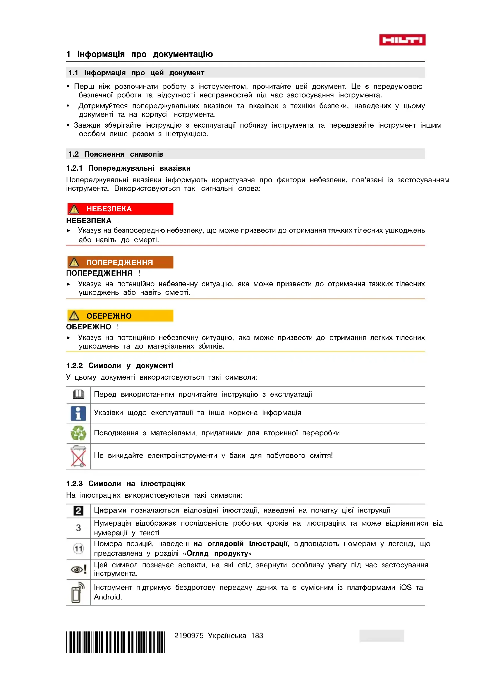 На ілюстраціях використовуються такі символи: Цифрами позначаються відповідні ілюстрації, наведені на початку цієї інструкції Нумерація відображає послідовність робочих кроків на ілюстраціях та може відрізнятися від нумерації у тексті Номера позицій, наведені на оглядовій ілюстрації, відповідають номерам у легенді, що представлена у розділі «Огляд продукту» Цей символ позначає аспекти, на які слід звернути особливу увагу під час застосування інструмента. Інструмент підтримує бездротову передачу даних та є сумісним із платформами iOS та Android.184 Українська 2190975 *2190975* Літій-іонна акумуляторна батарея Використовуваний тип літій-іонної акумуляторної батареї Hilti. Дотримуйтеся вказівок, наве- дених у розділі «Використання за призначенням». Ніколи не використовуйте акумуляторну батарею у якості ударного інструмента. Не допускайте падіння акумуляторної батареї. Не використовуйте акумуляторну батарею, яка зазнала ударного навантаження або була пошкоджена іншим чином.