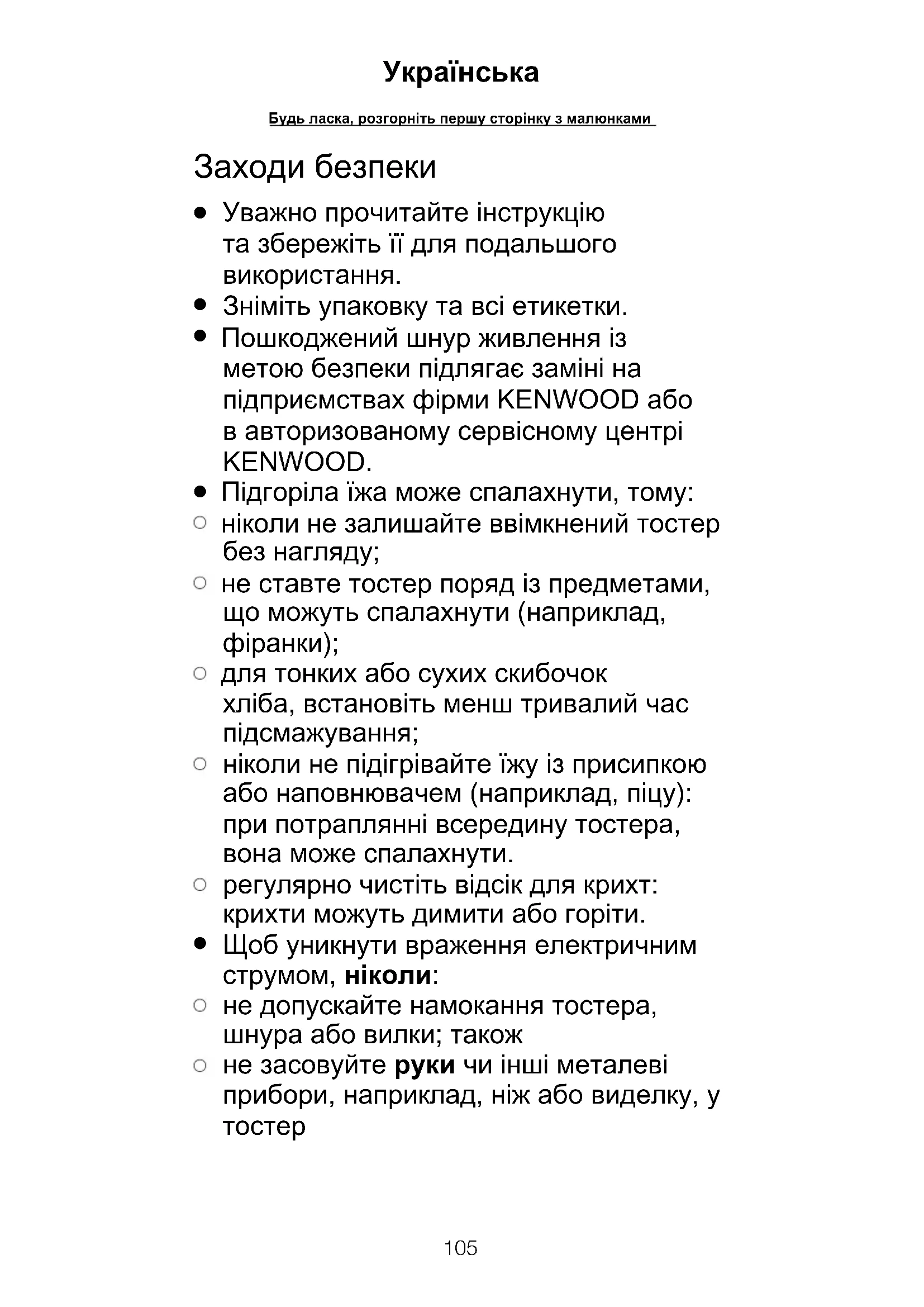 не засовуйте руки чи інші металеві прибори, наприклад, ніж або виделку, у тостерEnglish