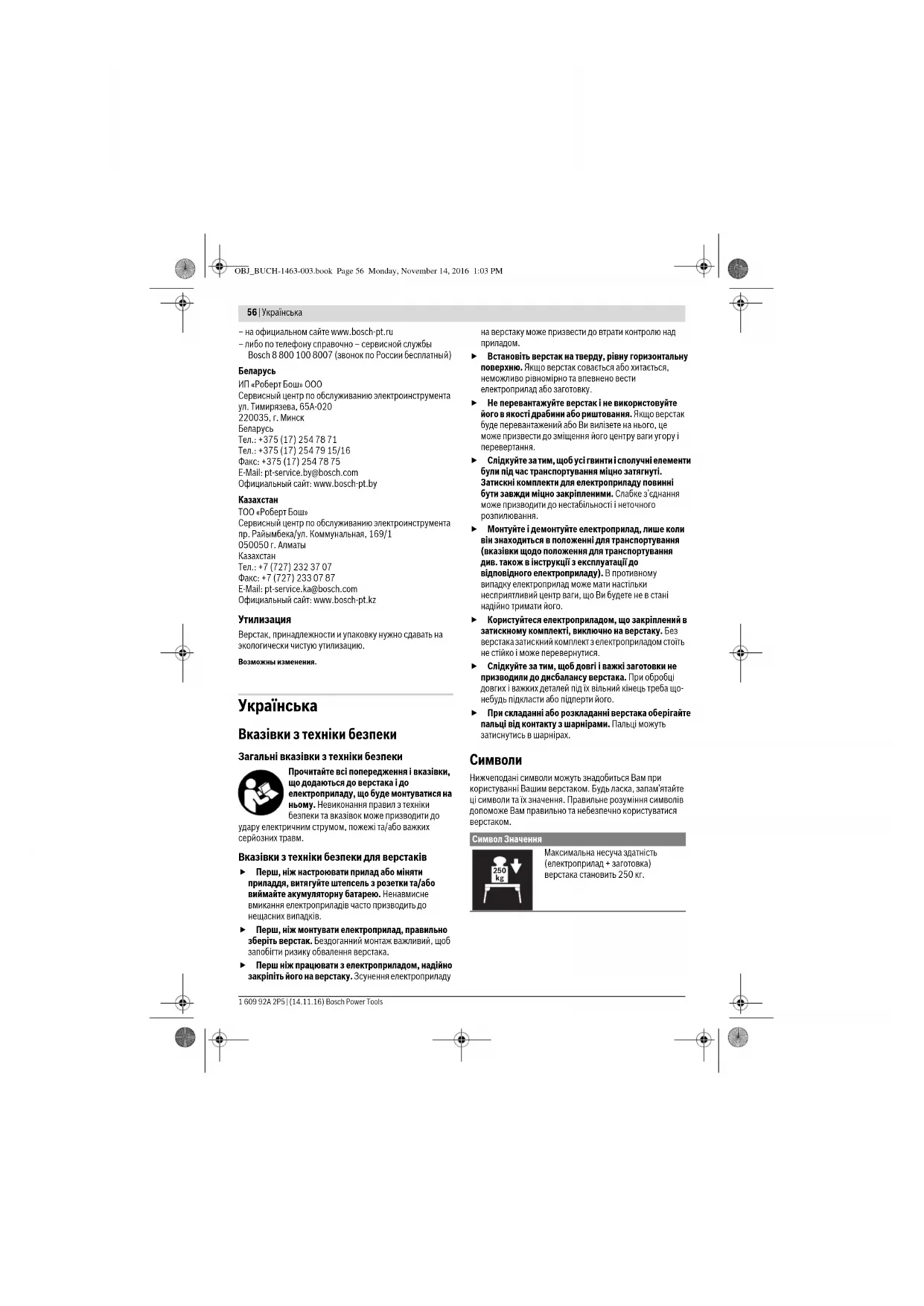 Символ Значення Максимальна несуча здатність (електроприлад + заготовка) верстака становить 250 кг.