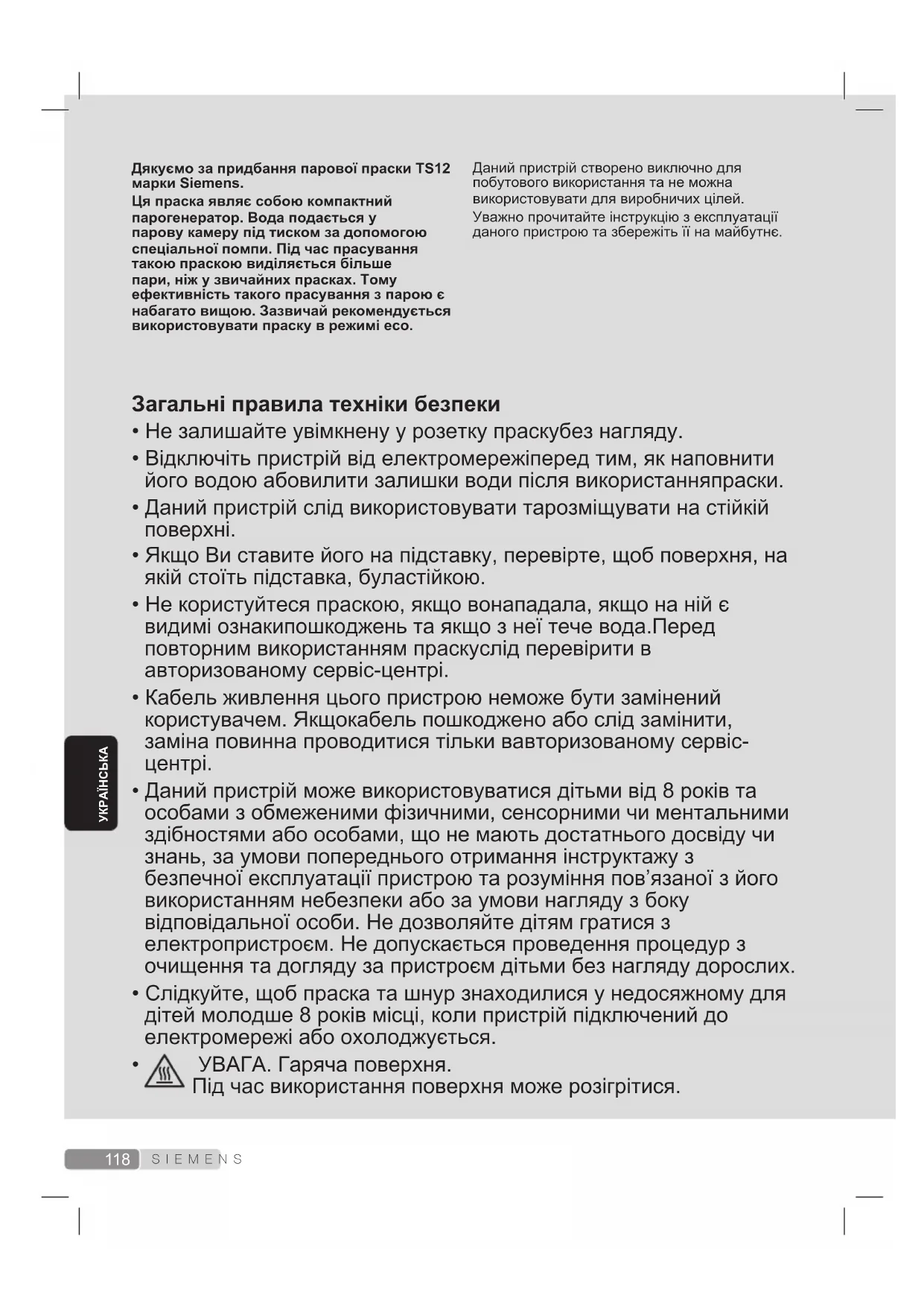 - Vízpumpálódikagőzrekeszbe • Eznormálisjelenség. Haafentemlítetteknemoldjákmegagondot,lépjenkapcsolatbaegyminősítettJavítóközponttal. A használati utasítás letölthető a Siemens helyi internetes oldaláról.118 S I E M E N S Дякуємо за придбання парової праски TS12 марки Siemens. Ця праска являє собою компактний парогенератор. Вода подається у парову камеру під тиском за допомогою спеціальної помпи. Під час прасування такою праскою виділяється більше пари, ніж у звичайних прасках. Тому ефективність такого прасування з парою є набагато вищою. Зазвичай рекомендується використовувати праску в режимі eco. Загальні правила техніки безпеки