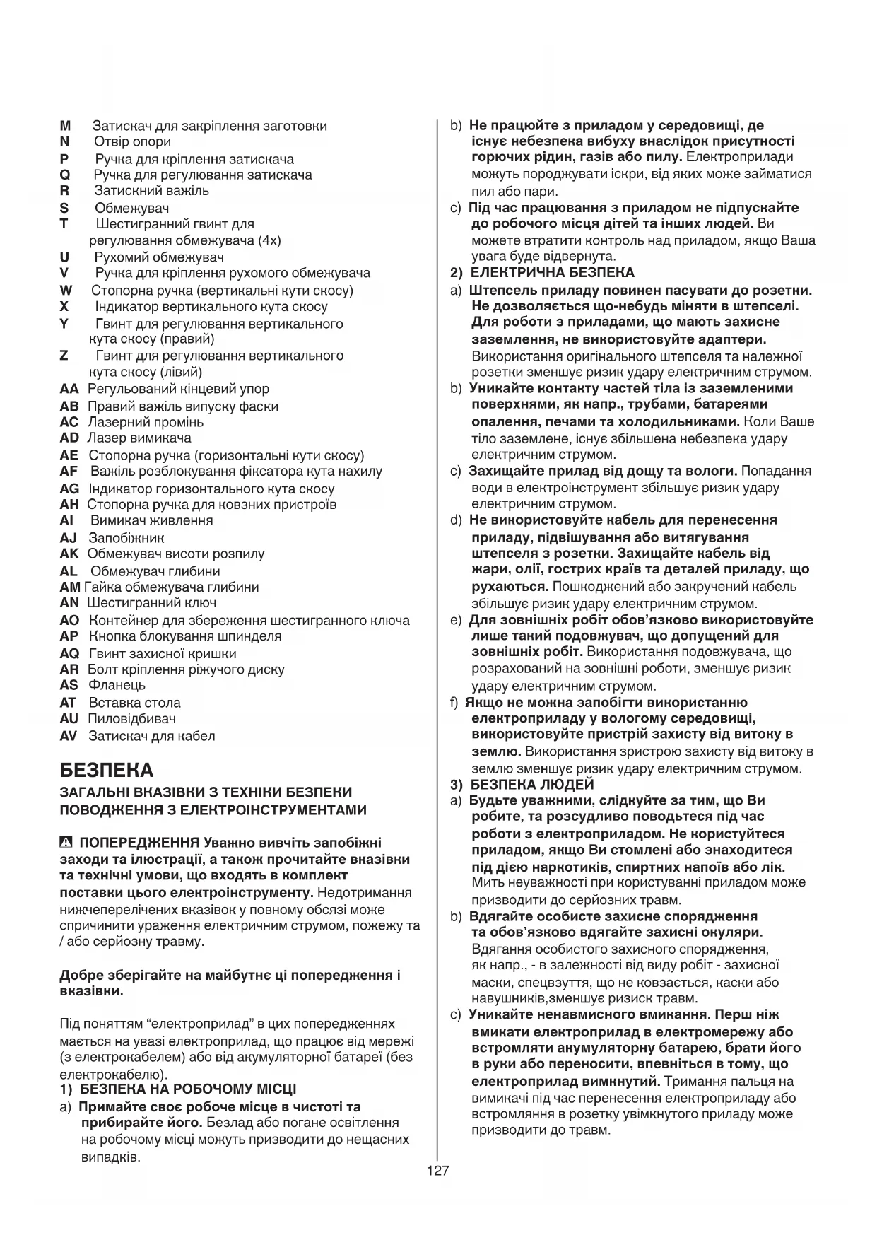 a) Будьте уважними, слідкуйте за тим, що Ви робите, та розсудливо поводьтеся під час роботи з електроприладом. Не користуйтеся приладом, якщо Ви стомлені або знаходитеся під дією наркотиків, спиртних напоїв або лік. Мить неуважності при користуванні приладом може призводити до серйозних травм. b) Вдягайте особисте захисне спорядження та обов’язково вдягайте захисні окуляри. Вдягання особистого захисного спорядження, як напр., - в залежності від виду робіт - захисної маски, спецвзуття, що не ковзається, каски або навушників,зменшує ризиск травм. c) Уникайте ненавмисного вмикання. Перш ніж вмикати електроприлад в електромережу або встромляти акумуляторну батарею, брати його в руки або переносити, впевніться в тому, що електроприлад вимкнутий. Тримання пальця на вимикачі під час перенесення електроприладу або встромляння в розетку увімкнутого приладу може призводити до травм. M Затискач для закріплення заготовки N Отвір опори P Ручка для кріплення затискача Q Ручка для регулювання затискача R Затискний важіль S Обмежувач T Шестигранний гвинт для регулювання обмежувача (4x) U Рухомий обмежувач V Ручка для кріплення рухомого обмежувача W Стопорна ручка (вертикальні кути скосу) X Індикатор вертикального кута скосу Y Гвинт для регулювання вертикального кута скосу (правий) Z Гвинт для регулювання вертикального кута скосу (лівий) AA Регульований кінцевий упор AB Правий важіль випуску фаски AC Лазерний промінь AD Лазер вимикача AE Стопорна ручка (горизонтальні кути скосу) AF Важіль розблокування фіксатора кута нахилу AG Індикатор горизонтального кута скосу AH Стопорна ручка для ковзних пристроїв AI Вимикач живлення AJ Запобіжник AK Обмежувач висоти розпилу AL Обмежувач глибини AM Гайка обмежувача глибини AN Шестигранний ключ AO Контейнер для збереження шестигранного ключа AP Кнопка блокування шпинделя AQ Гвинт захисної кришки AR Болт кріплення ріжучого диску AS Фланець AT Вставка стола AU Пиловідбивач AV Затискач для кабел