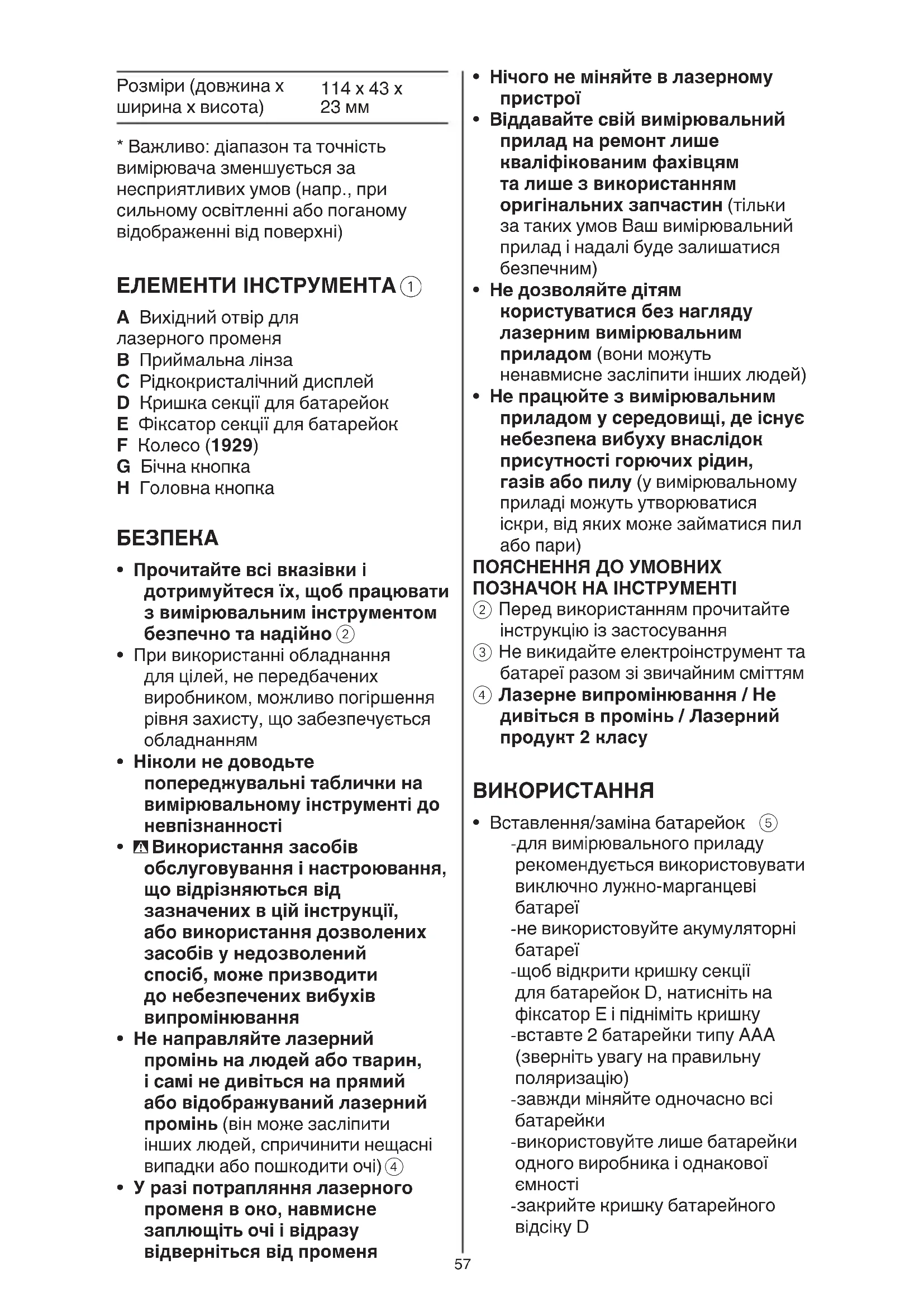 - У разі потрапляння лазерного променя в око, навмисне заплющіть очі і відразу відверніться від променя58 раз, щоб зупинити і зберегти вимірювання (можна відтворити до 2 вимірювань)