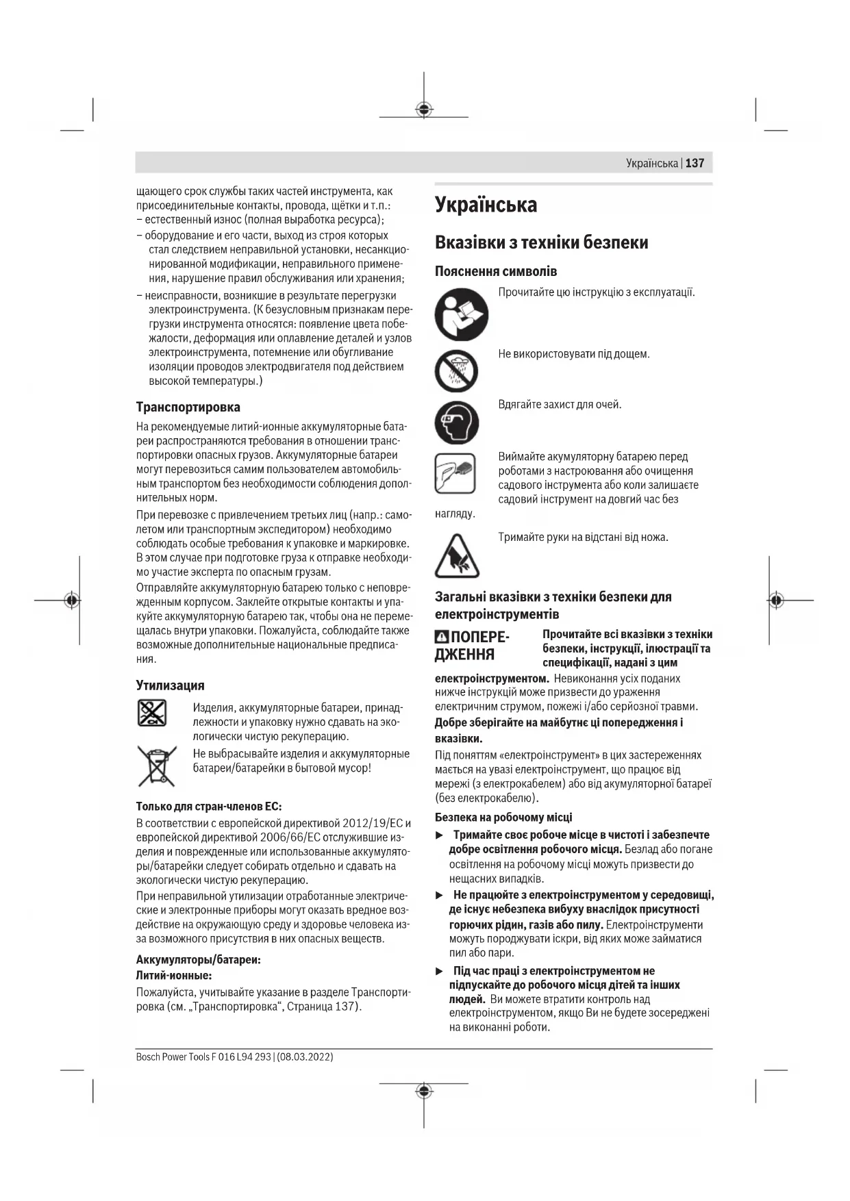 Вироби, акумуляторні батареї, приладдя і упаковку треба здавати на екологічно чисту повторну переробку. Не викидайте вироби та акумуляторні батареї/батарейки в побутове сміття! Лише для країнЄС: Відповідно до європейської директиви 2012/19/ЄС відпрацьовані вироби та відповідно до європейської директиви 2006/66/ЄС пошкоджені або відпрацьовані акумуляторні батареї/батарейки повинні збиратись окремо й утилізуватися в екологічно чистий спосіб. При неправильній утилізації відпрацьовані електричні та електронні прилади можуть мати шкідливий вплив на навколишнє середовище та здоров’я людини через можливу наявність небезпечних речовин. Акумулятори/батарейки: Літієво-іонні: Будь ласка, зважайте на вказівки в розділі Транспортування (див. „Транспортування“, Сторінка145).