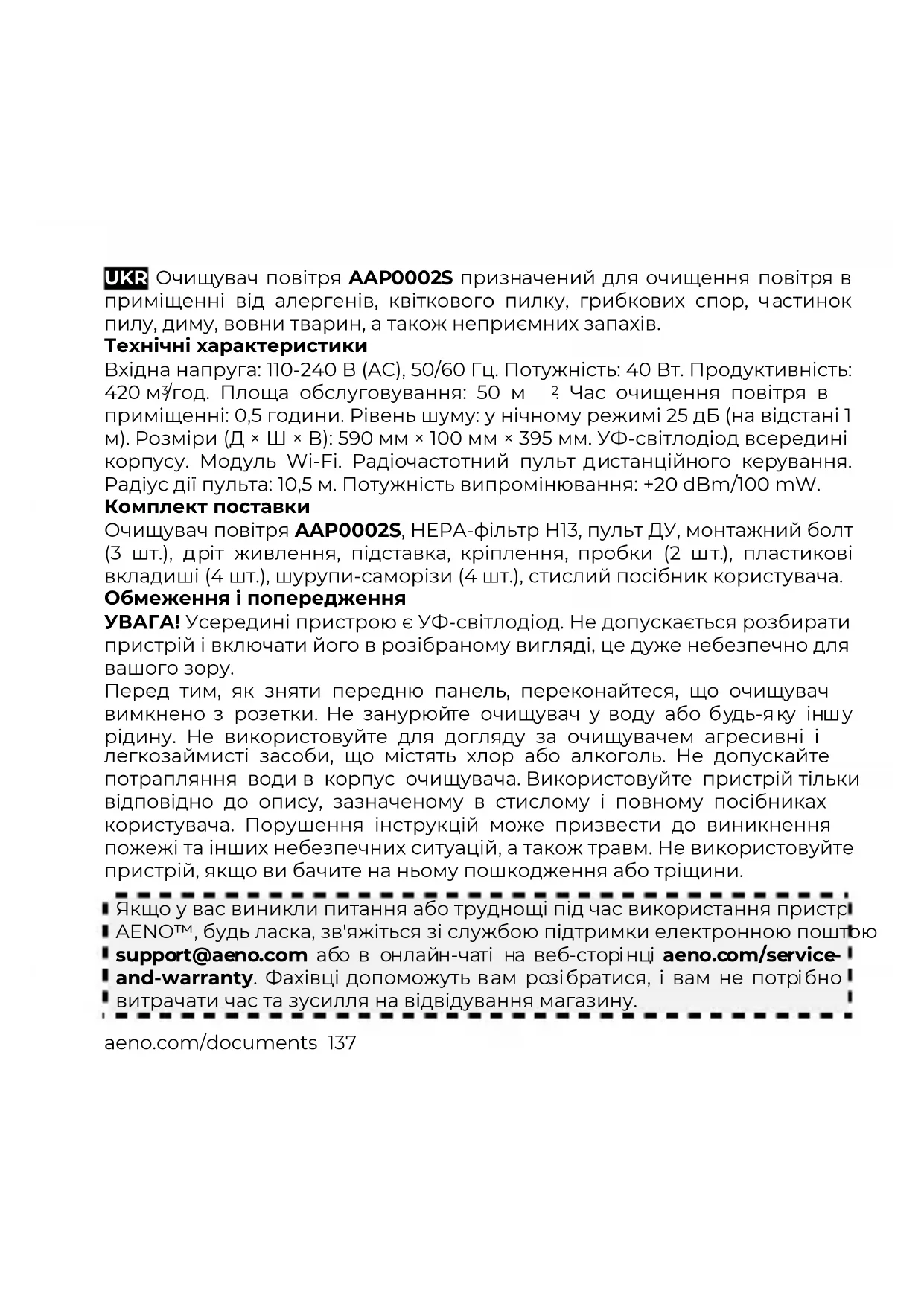 - Ako povezivanje nije uspelo, proverite da li je uređaj spojen na struju i uključen, a ikona Wi-Fi na kontrolnoj ploči uređaja treperi. Naknadno proverite Wi-Fii podešavanja rutera (aeno.com/router- help) ili ga resetujte, a zatim ponovite postupak povezivanja.aeno.com/documents 137 UKR Очищувач повітря AAP0002S призначений для очищення повітря в приміщенні від алергенів, квіткового пилку, грибкових спор, частинок пилу, диму, вовни тварин, а також неприємних запахів. Технічні характеристики Вхідна напруга: 110-240 В (AC), 50/60 Гц. Потужність: 40 Вт. Продуктивність: 420 м