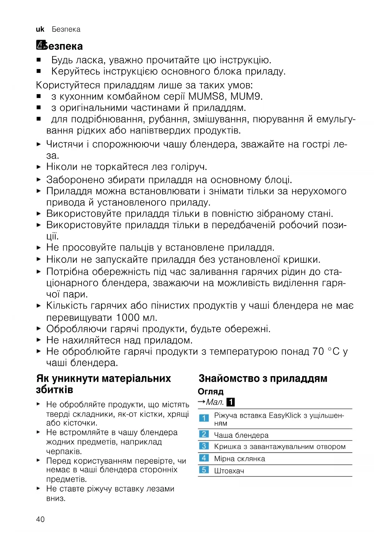 Прилад гуде. Ніж заблокований або застряг. Усуньте блокування. Рідина витікає з ріжучої вставки. Ущільнення між чашею блендера та рі- жучою вставкою відсутнє. Установіть ущільнення на ножову вставку EasyKlick. Надруковано на папері, на 100% зробленому з переробленої макулатури 42 Надруковано на папері, на 100% зробленому з переробленої макулатуриБезопасность ruБезопасность Безопасность ¡ Внимательно прочитайте данное руководство. ¡ Соблюдайте инструкцию к основному блоку. Используйте принадлежности только: ¡ с кухонным прибором серии MUMS8, MUM9; ¡ с оригинальными частями и принадлежностями. ¡ для измельчения, рубки, перемешивания, пюрирования и эмуль- гирования жидких или полутвердых продуктов. При чистке и опорожнении стакана блендера берегитесь острых
