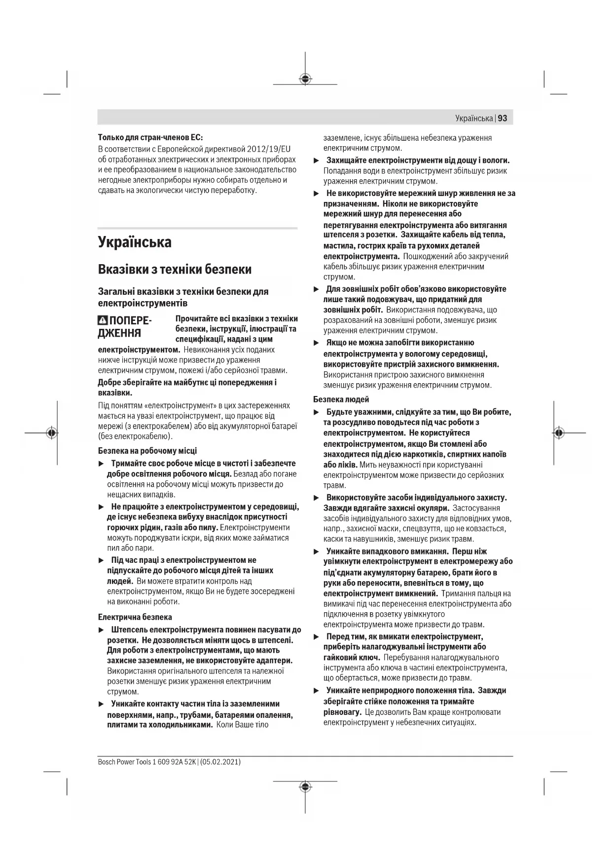u Використовуйте засоби індивідуального захисту. Завжди вдягайте захисні окуляри. Застосування засобів індивідуального захисту для відповідних умов, напр.,захисної маски, спецвзуття, що не ковзається, каски та навушників, зменшує ризик травм. u Уникайте випадкового вмикання. Перш ніж увімкнути електроінструмент в електромережу або під’єднати акумуляторну батарею, брати його в руки або переносити, впевніться в тому, що електроінструмент вимкнений. Тримання пальця на вимикачі під час перенесення електроінструмента або підключення в розетку увімкнутого електроінструмента може призвести до травм. u Перед тим, як вмикати електроінструмент, приберіть налагоджувальні інструменти або гайковий ключ. Перебування налагоджувального інструмента або ключа в частині електроінструмента, що обертається, може призвести до травм. u Уникайте неприродного положення тіла. Завжди зберігайте стійке положення та тримайте рівновагу. Це дозволить Вам краще контролювати електроінструмент у небезпечних ситуаціях. Bosch Power Tools 1 609 92A 52K | (05.02.2021)94 | Українська u Вдягайте придатний одяг. Не вдягайте просторий одяг та прикраси. Не підставляйте волосся й одяг до деталей, що рухаються. Просторий одяг, довге волосся та прикраси можуть потрапити в деталі, що