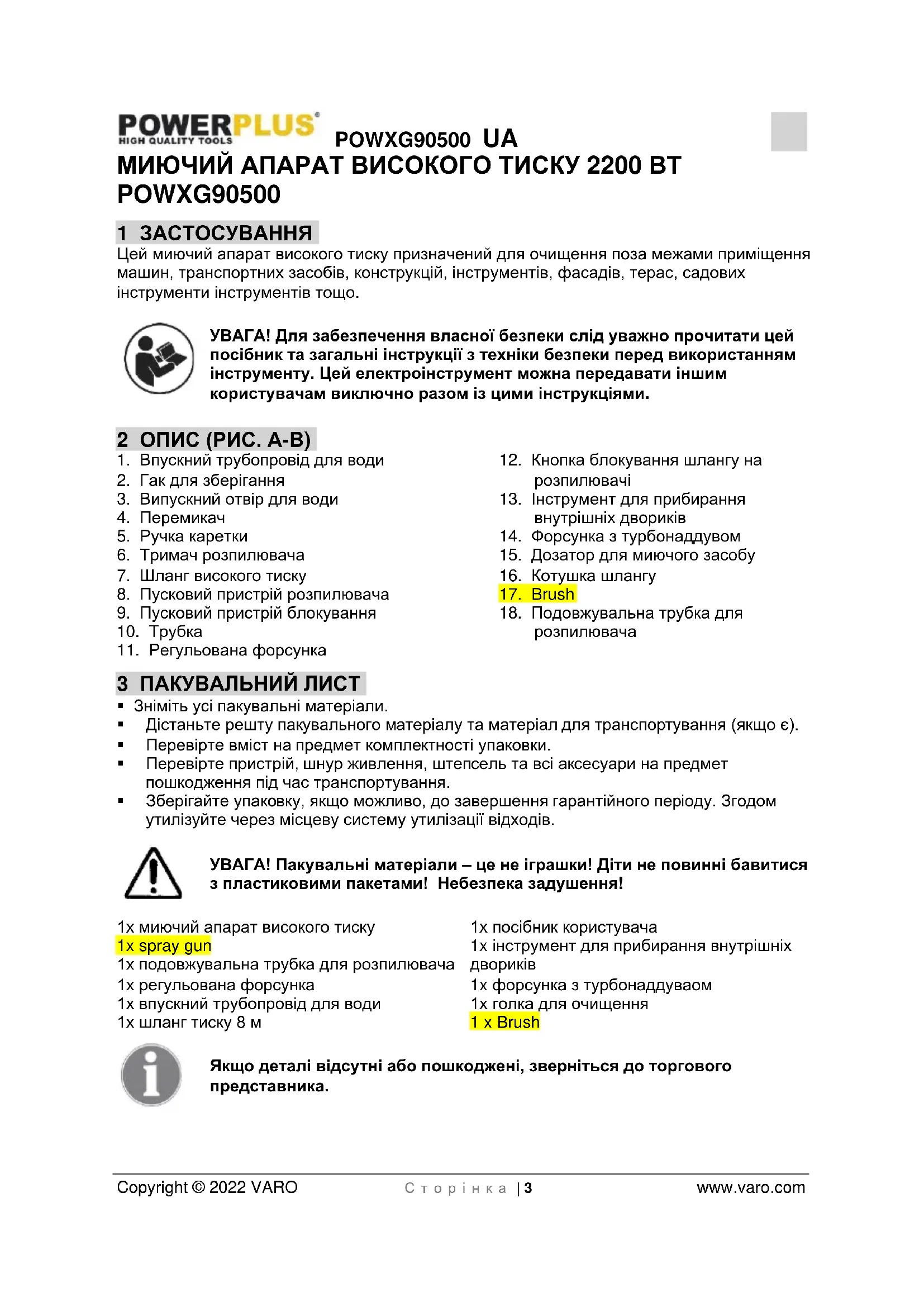 Завантажте інструкції для вашого мийка високого тиску у форматі PDF безкоштовно! Знайдіть свій посібник POWXG90500 - PowerPlus і поверніть собі контроль над електронним пристроєм. На цій сторінці опубліковані всі документи, необхідні для використання вашого пристрою. POWXG90500 бренду PowerPlus.