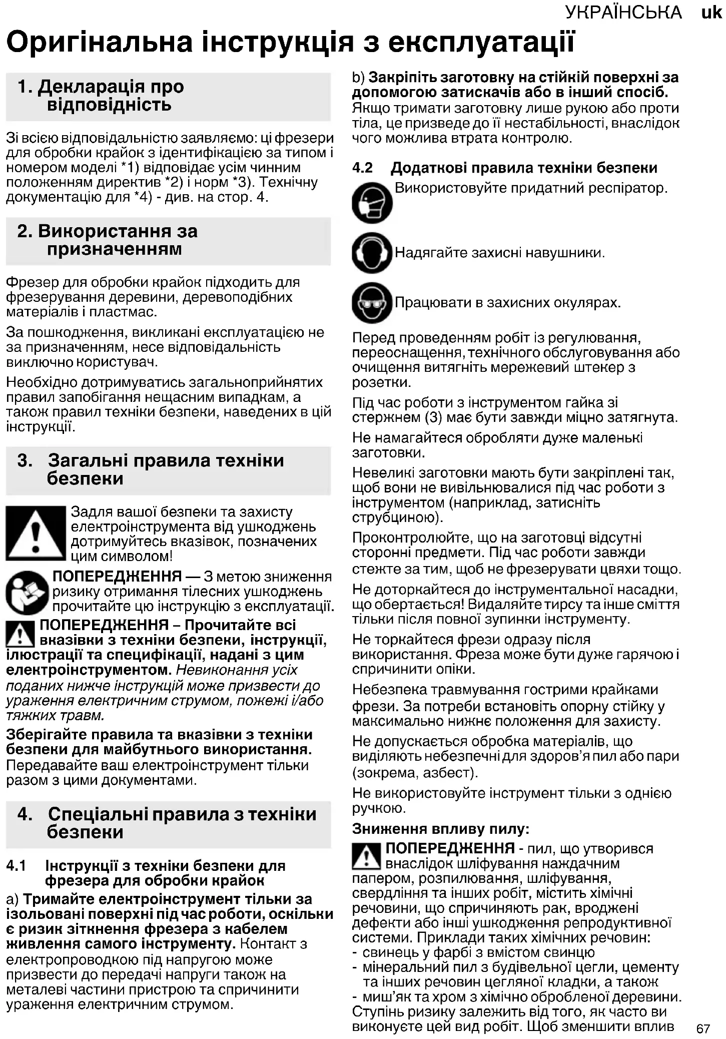 Оригінальна інструкція з експлуатації Зі всією відповідальністю заявляємо: ці фрезери для обробки крайок з ідентифікацією за типом і номером моделі *1) відповідає усім чинним положенням директив *2) і норм *3). Технічну документацію для *4) - див. на стор. 4. Фрезер для обробки крайок підходить для фрезерування деревини, деревоподібних матеріалів і пластмас. За пошкодження, викликані експлуатацією не за призначенням, несе відповідальність