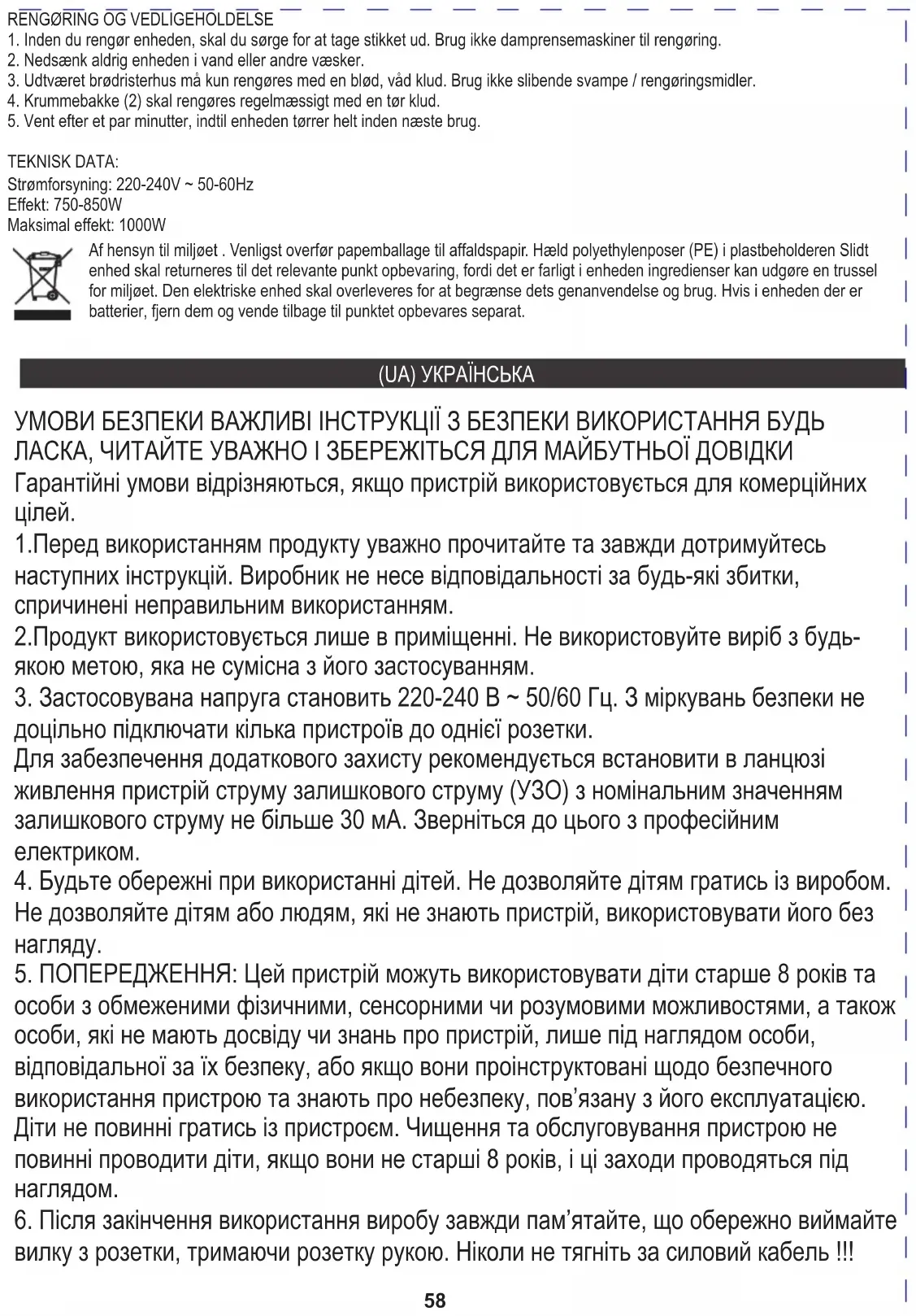 ТЕХНІЧНІ ДАНІ: Блок живлення: 220-240В ~ 50-60Гц Потужність: 750-850 Вт Максимальна потужність: 1000 Вт У інтересах навколишнього середовища. Будь ласка, віддайте картонну упаковку в місце збору мукулатури. Політиленові мішки (PE) викинути в смітник для пластику. Відпрацьований пристрій повинен бути відправлений у відповідну точку зберігання, тому що в пристрої є небезпечні інгредієнти, які можуть становити загрозу навколишньому середовищу. Електричний пристрій потрібно повернути так, щоб обмежити його повторне використання. Якщо у пристрої є батерейки, то потрібно їх витягнути і віддати до відповідного пунтку.61 БЕЗБЕДНОСНИ УСЛОВИ ВАЖНА УПУТСТВА О БЕЗБЕДНОСТИ УПОТРЕБЕ МОЛИМО ВАС ПАЖЉИВО ПРОЧИТАЈТЕ И ЧУВАЈТЕ У БУДУЋОЈ РЕФЕРЕНЦИ Гарантни услови се разликују ако се уређај користи у комерцијалне сврхе.