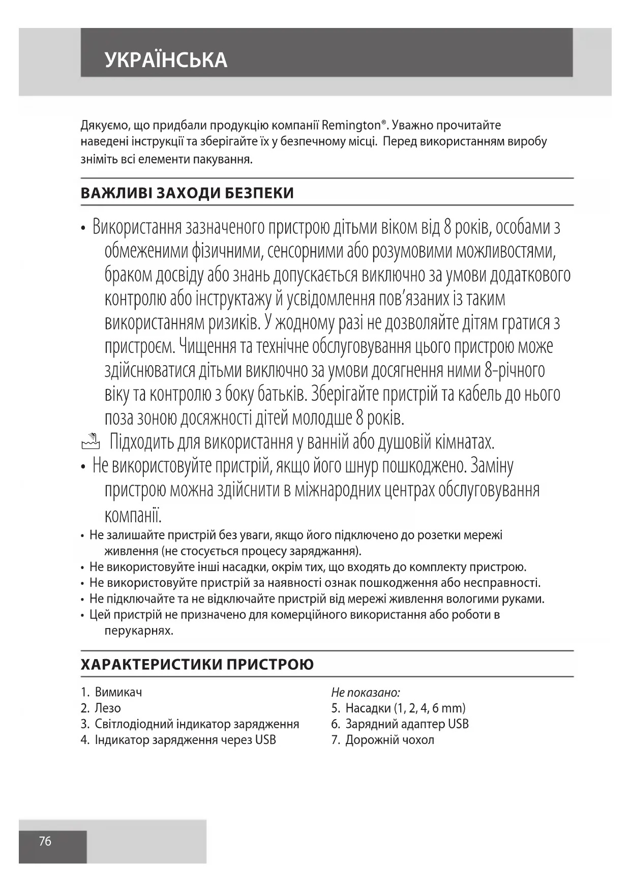 AE76 Дякуємо, що придбали продукцію компанії Remington®. Уважно прочитайте наведені інструкції та зберігайте їх у безпечному місці. Перед використанням виробу зніміть всі елементи пакування. ВАЖЛИВІ ЗАХОДИ БЕЗПЕКИ