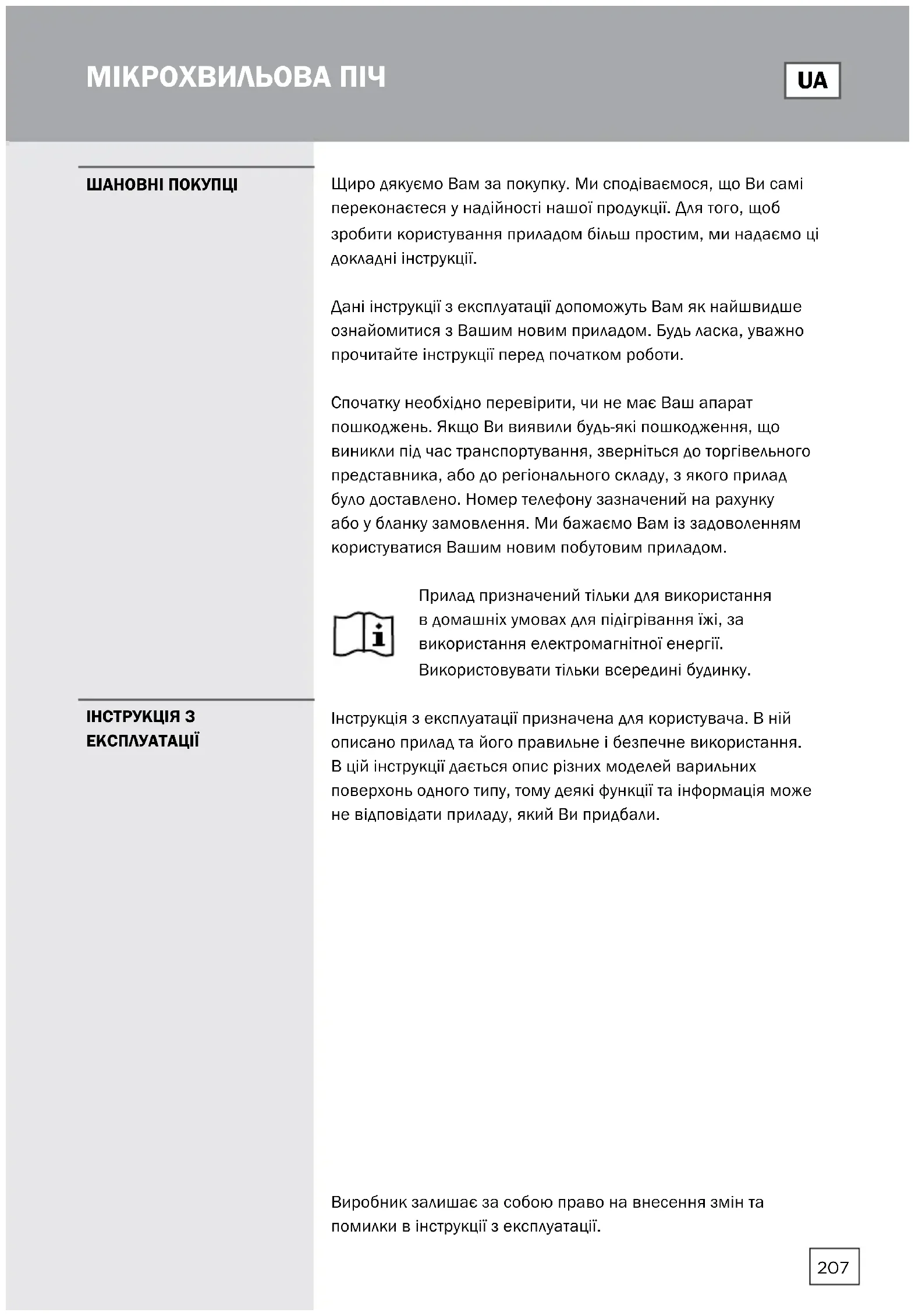 Щиро дякуємо Вам за покупку. Ми сподіваємося, що Ви самі переконаєтеся у надійності нашої продукції. Для того, щоб зробити користування приладом більш простим, ми надаємо ці докладні інструкції. Дані інструкції з експлуатації допоможуть Вам як найшвидше ознайомитися з Вашим новим приладом. Будь ласка, уважно прочитайте інструкції перед початком роботи. Спочатку необхідно перевірити, чи не має Ваш апарат пошкоджень. Якщо Ви виявили будь-які пошкодження, що виникли під час транспортування, зверніться до торгівельного представника, або до регіонального складу, з якого прилад було доставлено. Номер телефону зазначений на рахунку або у бланку замовлення. Ми бажаємо Вам із задоволенням користуватися Вашим новим побутовим приладом. Прилад призначений тільки для використання в домашніх умовах для підігрівання їжі, за використання електромагнітної енергії. Використовувати тільки всередині будинку. Інструкція з експлуатації призначена для користувача. В ній описано прилад та його правильне і безпечне використання. В цій інструкції дається опис різних моделей варильних поверхонь одного типу, тому деякі функції та інформація може не відповідати приладу, який Ви придбали. Виробник залишає за собою право на внесення змін та помилки в інструкції з експлуатації. ШАНОВНІ ПОКУПЦІ ІНСТРУКЦІЯ З ЕКСПЛУАТАЦІЇ