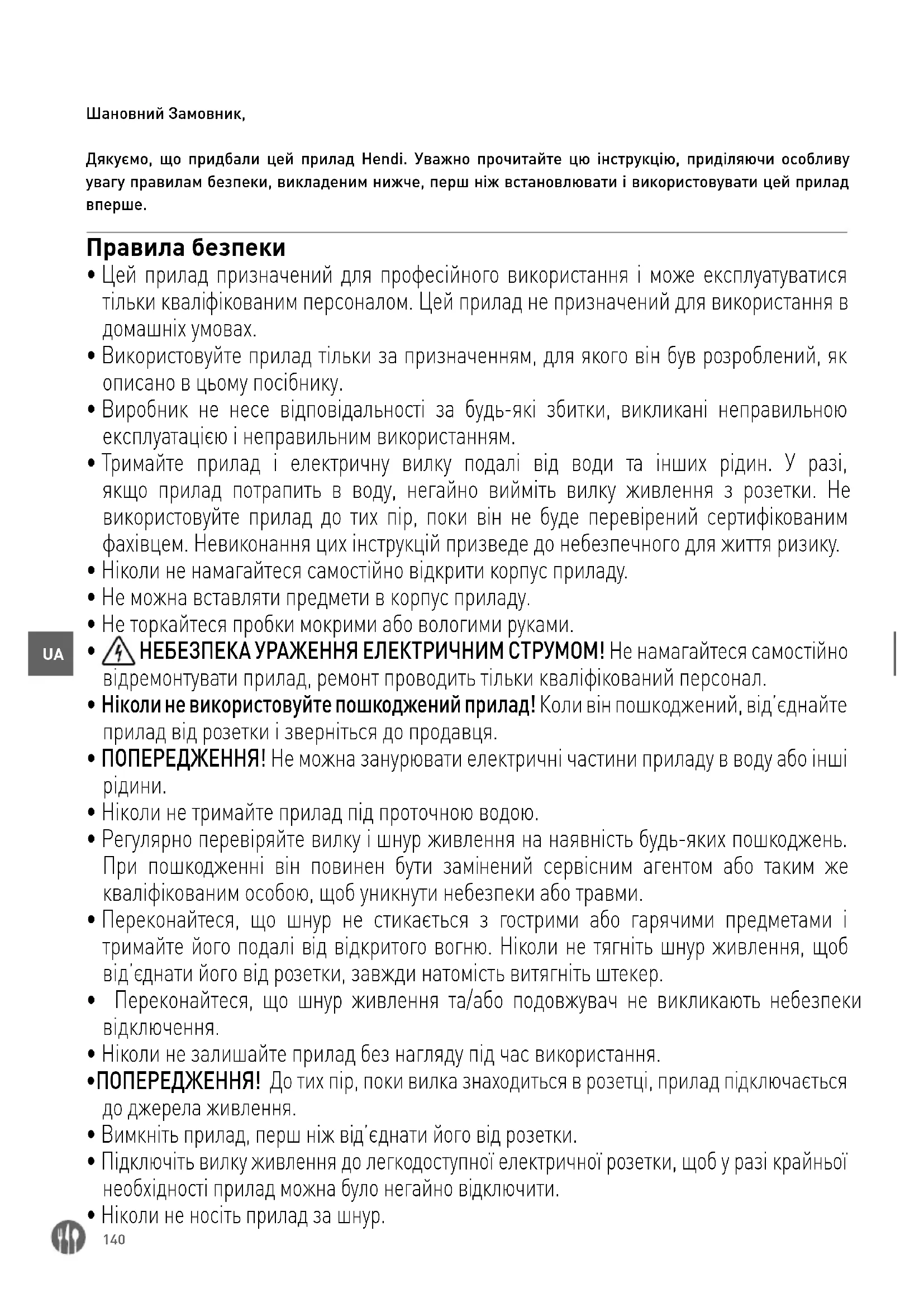Шановний Замовник, Дякуємо, що придбали цей прилад Hendi. Уважно прочитайте цю інструкцію, приділяючи особливу увагу правилам безпеки, викладеним нижче, перш ніж встановлювати і використовувати цей прилад