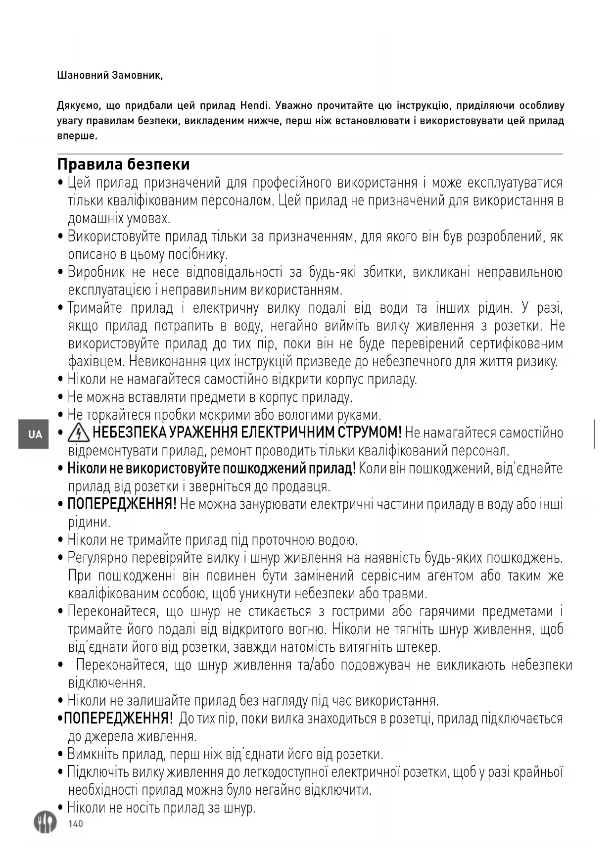 Шановний Замовник, Дякуємо, що придбали цей прилад Hendi. Уважно прочитайте цю інструкцію, приділяючи особливу увагу правилам безпеки, викладеним нижче, перш ніж встановлювати і використовувати цей прилад