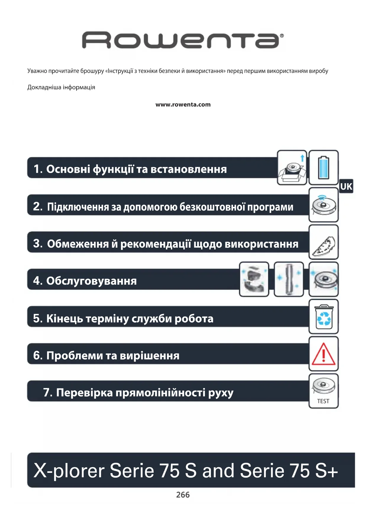 www.rowenta.com Уважно прочитайте брошуру «Інструкції з техніки безпеки й використання» перед першим використанням виробу Докладніша інформація X-plorer Serie 75 S and Serie 75 S+